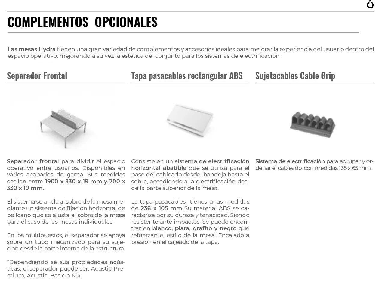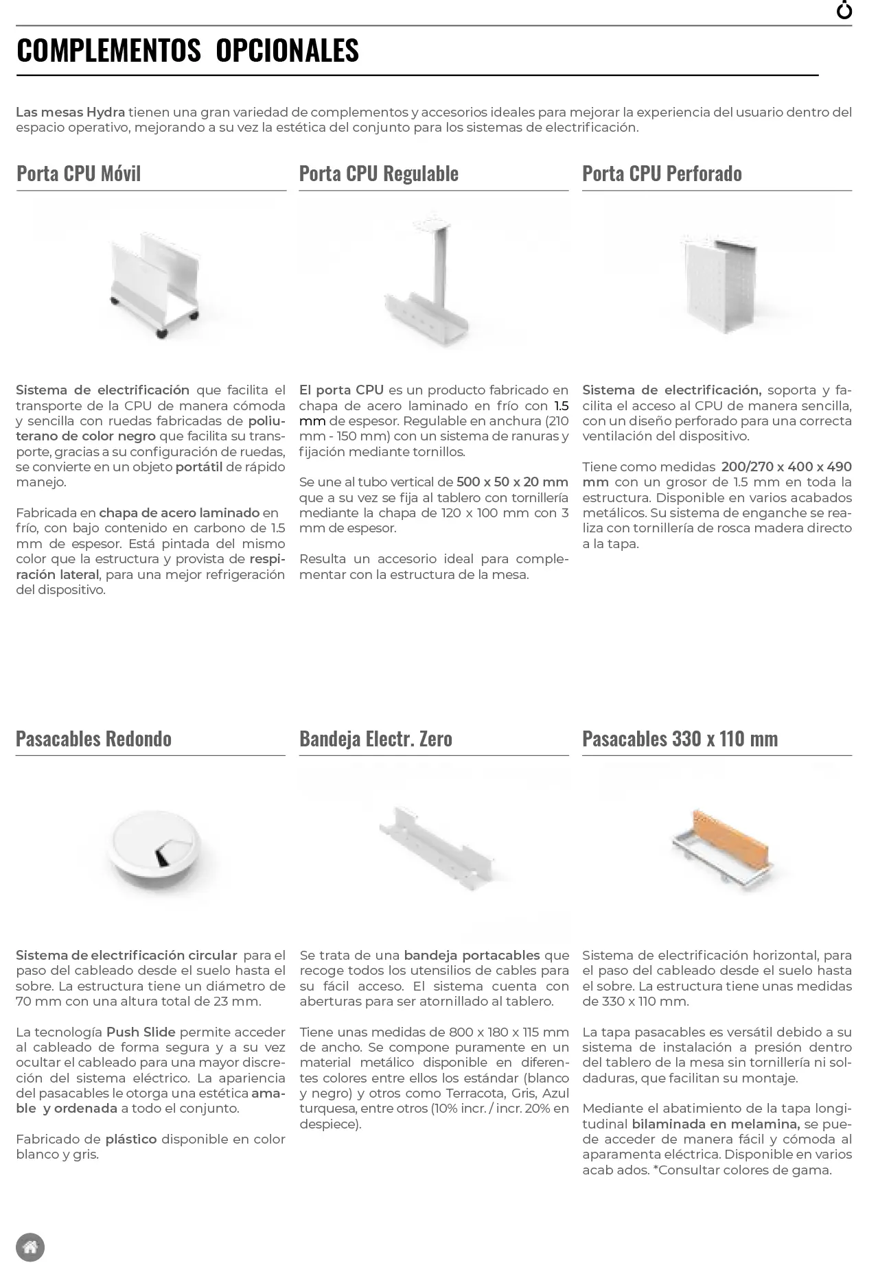La serie HYDRA ZERO resalta por la reducción del cimbreado, debido a que las patas están formadas por una estructura de acero, que da sostenibilidad vertical a la mesa y por la unión entre patas y viga que proporcionan estabilidad en el plano horizontal.