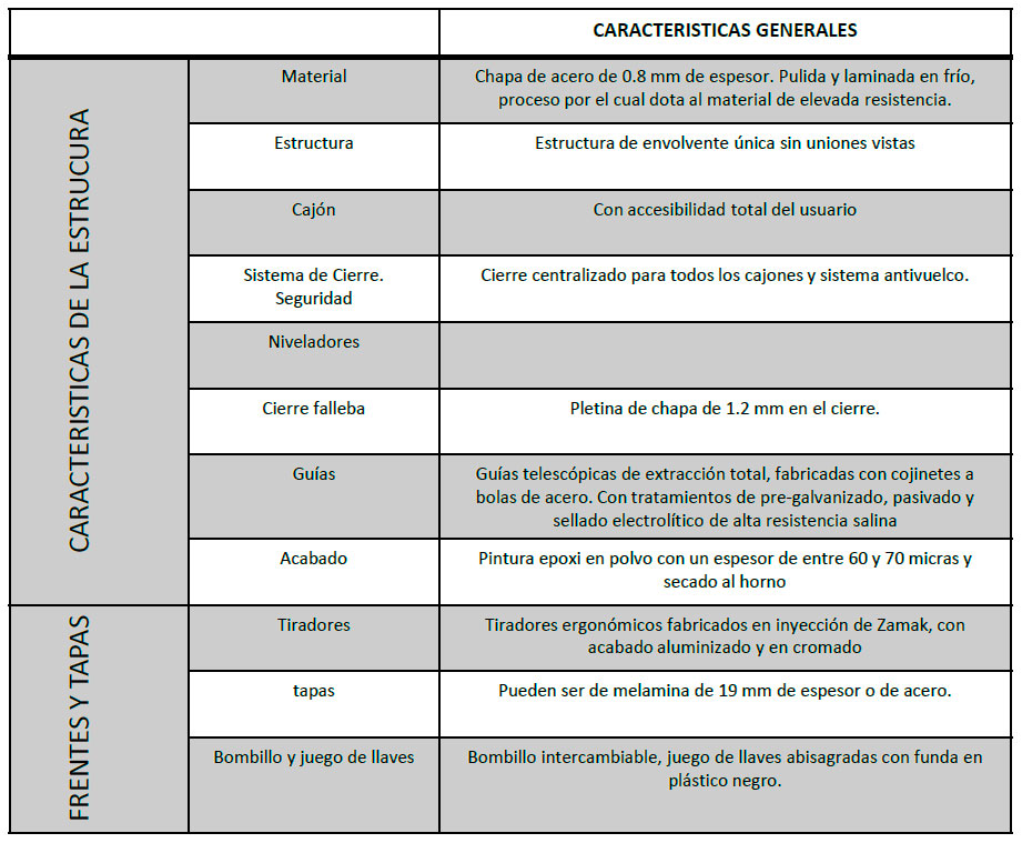 Cajón fabricado en chapa de acero de 0.8 mm de espesor, plegada y soldada por puntos con soldadura de resistencia eléctrica. Con acabado en pintura epoxi.