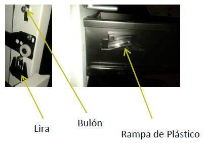 Incorpora el sistema antivuelco, que consiste en el accionamiento de un bulón que se inserta en la lira de platico, cuando cierra el cajón, con lo cual deja abrir otros cajones Cuando un cajón sale, el bulón sale de la lira y hace que los otros cajones tropiecen en la rampa de platico, situada en el cajón.