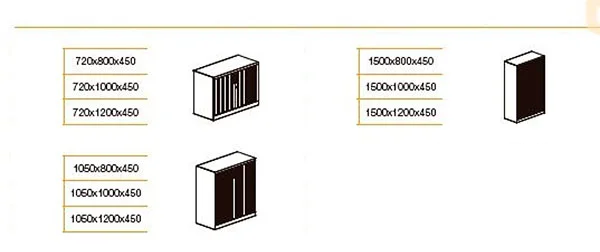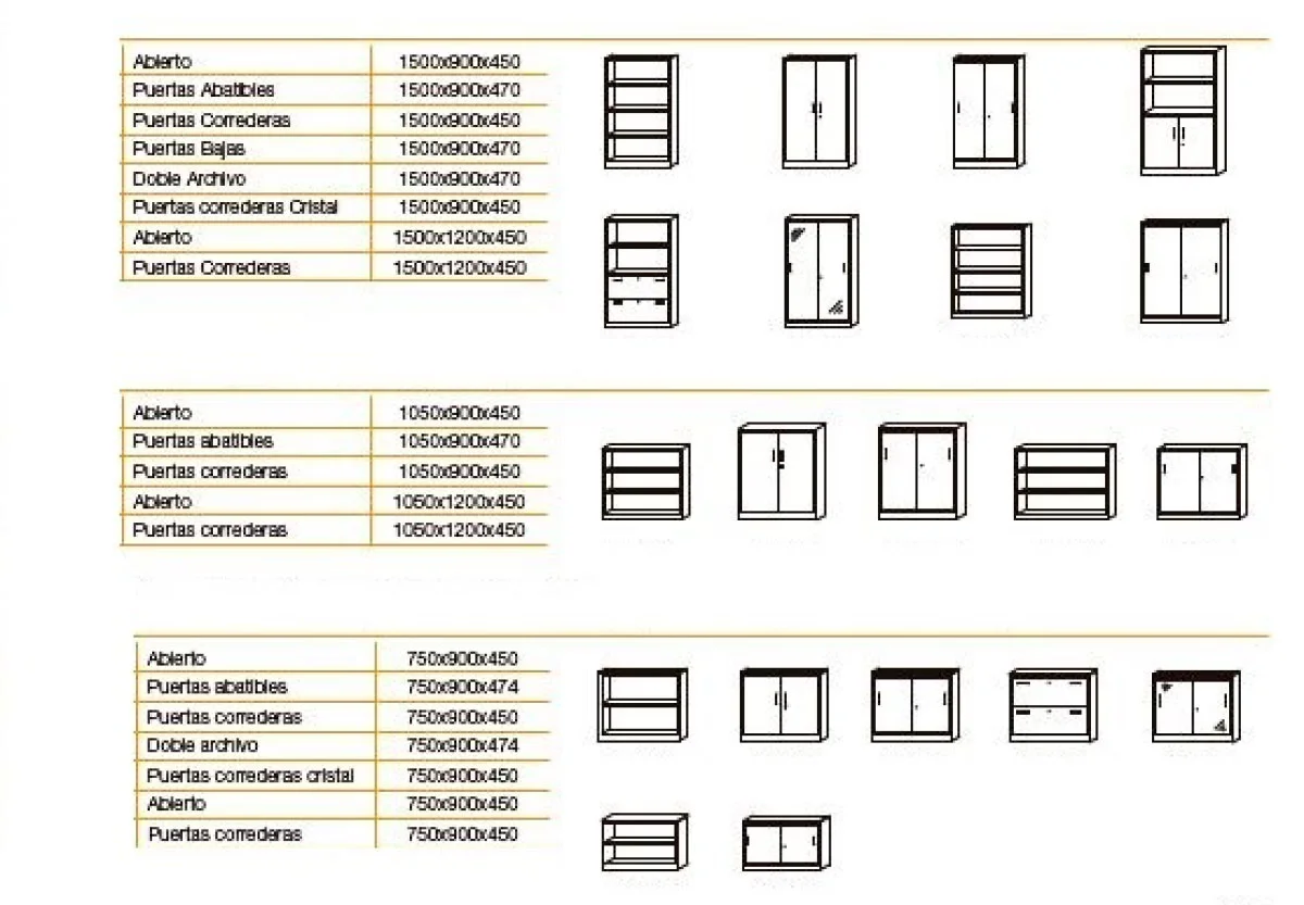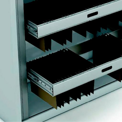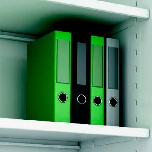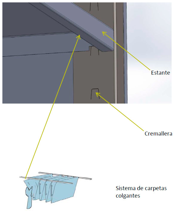 Los estantes están preparados para carpetas colgantes, de 34 cm, con el visor en la parte frontal de la carpeta. Dichas carpetas se cuelgan en la parte inferior del estante, en los pliegues anterior y posterior, para el máximo aprovechamiento del hueco en el armario.
