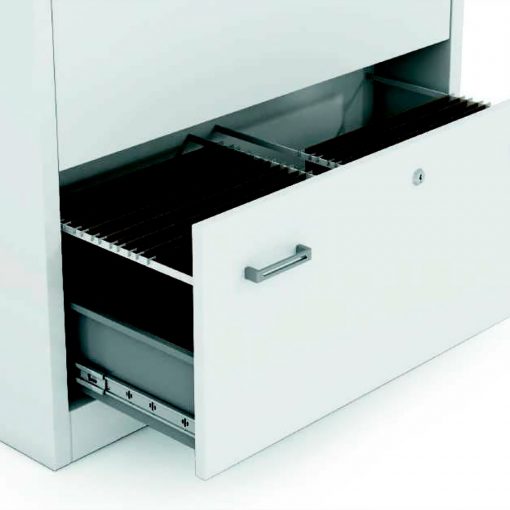 La apertura del cajón es de 370 mm , con buenas características de accesibilidad, preparando el archivador para carpetas colgantes.