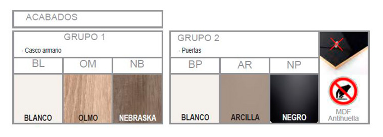 La estructura de los armarios y los estantes se realizan con panel de partículas aglomeradas revestido por ambos lados con papel decorativo impregnado en resinas melamínicas.