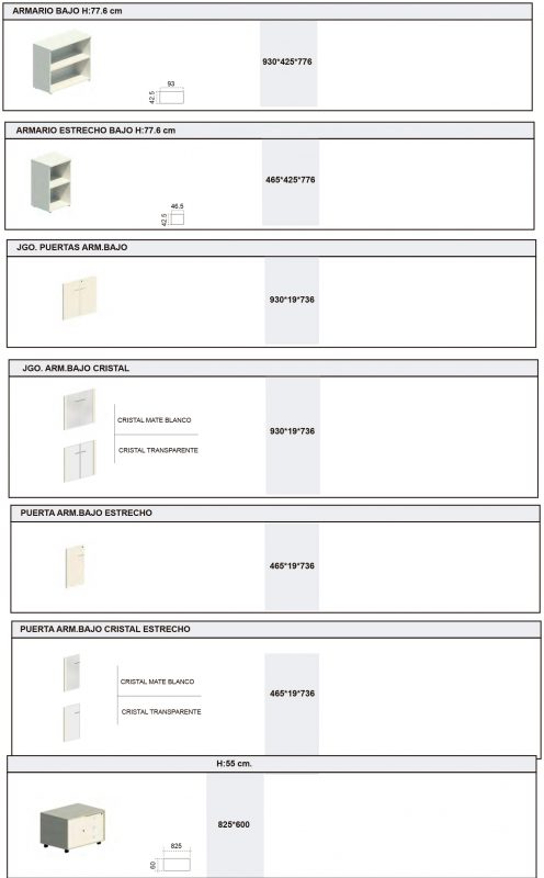 El programa de armarios se compone de una gama de medidas que permite la elección más idónea a cada exigencia de archivo. La modulación se realiza en tres alturas 77.5cm-141.5cm-208.5cm, en dos anchuras 46,5cm-93cm y un fondo siempre de 42,2cm. También existe un módulo de 71 cm altura x 80 cm ancho x 42.2 cm fondo para colocar a continuación de una mesa.