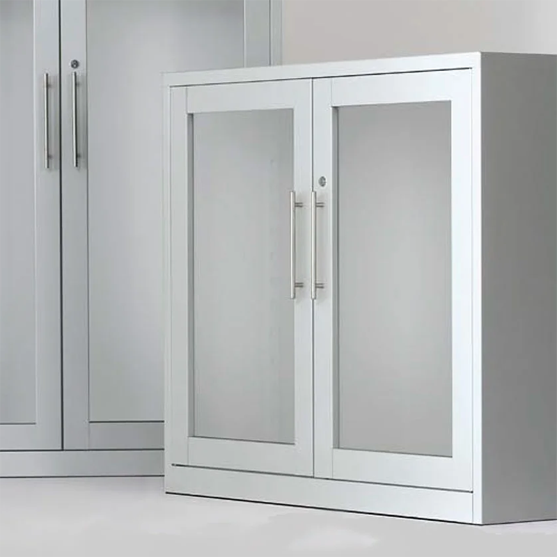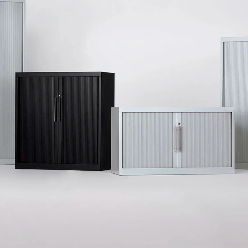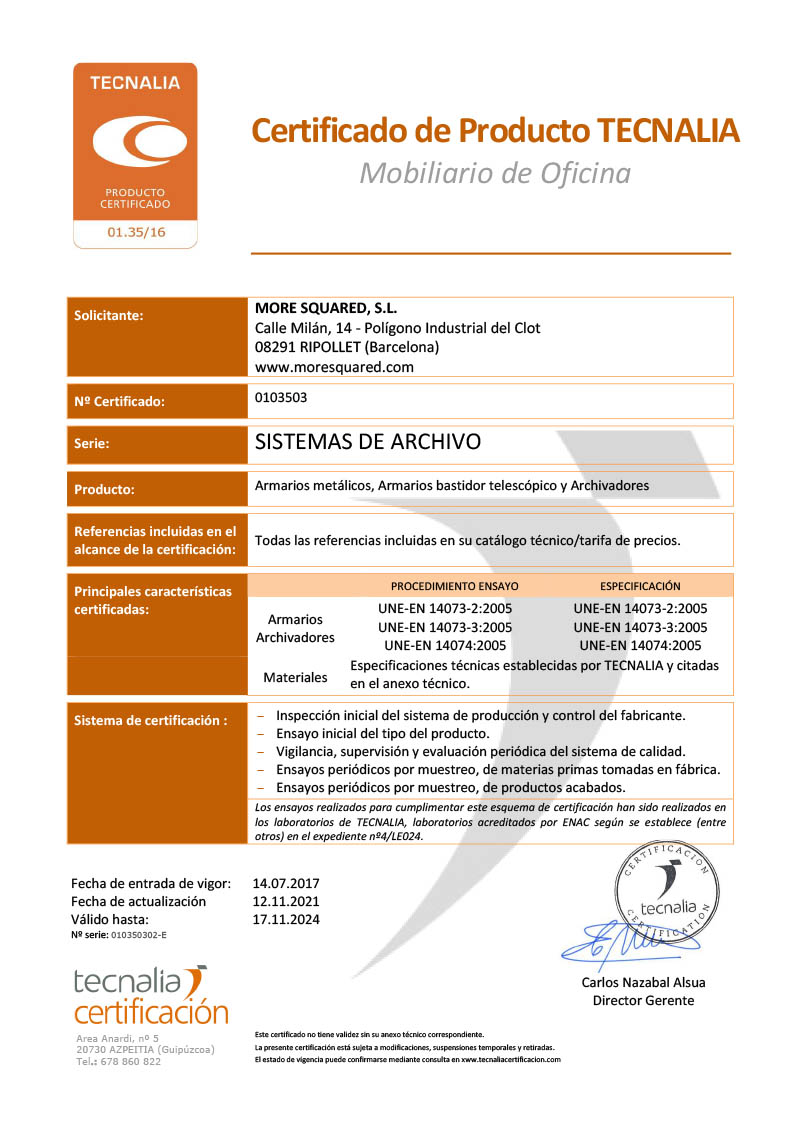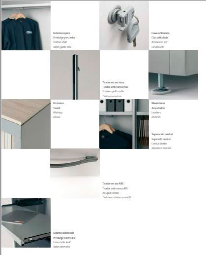Cerradura de varilla con 2 llaves articuladas de acero con funda de plástico. Constan de 4 niveladores metálicos regulables desde el interior recubierto por una capa plástica. Los laterales de los armarios incorporan una guía perforada que permite situar los estantes y accesorios a la altura deseada, ofreciendo una amplia capacidad de archivo.