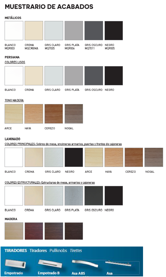 Carta de colores Moresquared. Opción de encimera y puertas en estratificada/laminada, madera o cristal para todo tipo de armarios. A juego con el mobiliario seleccionado.