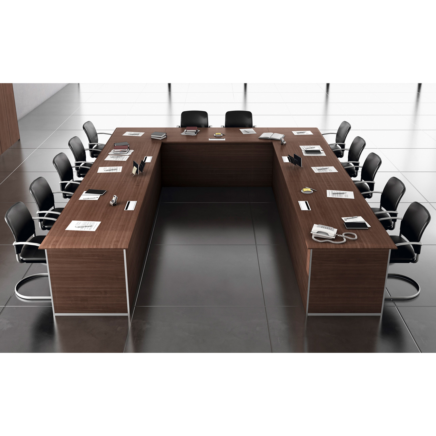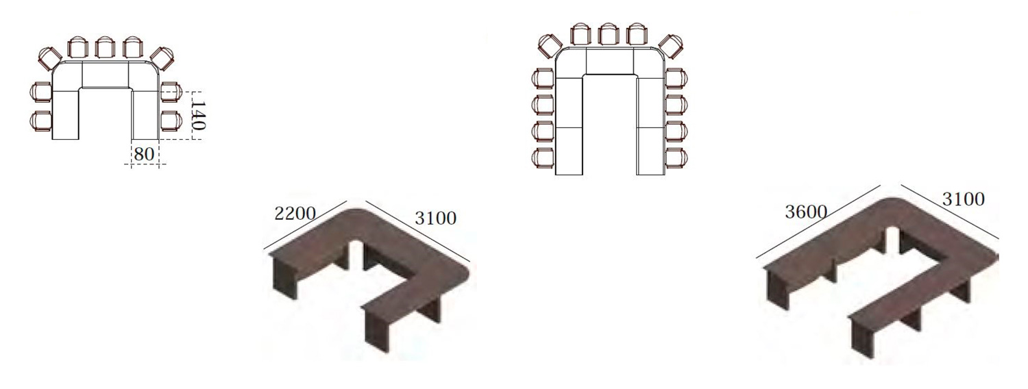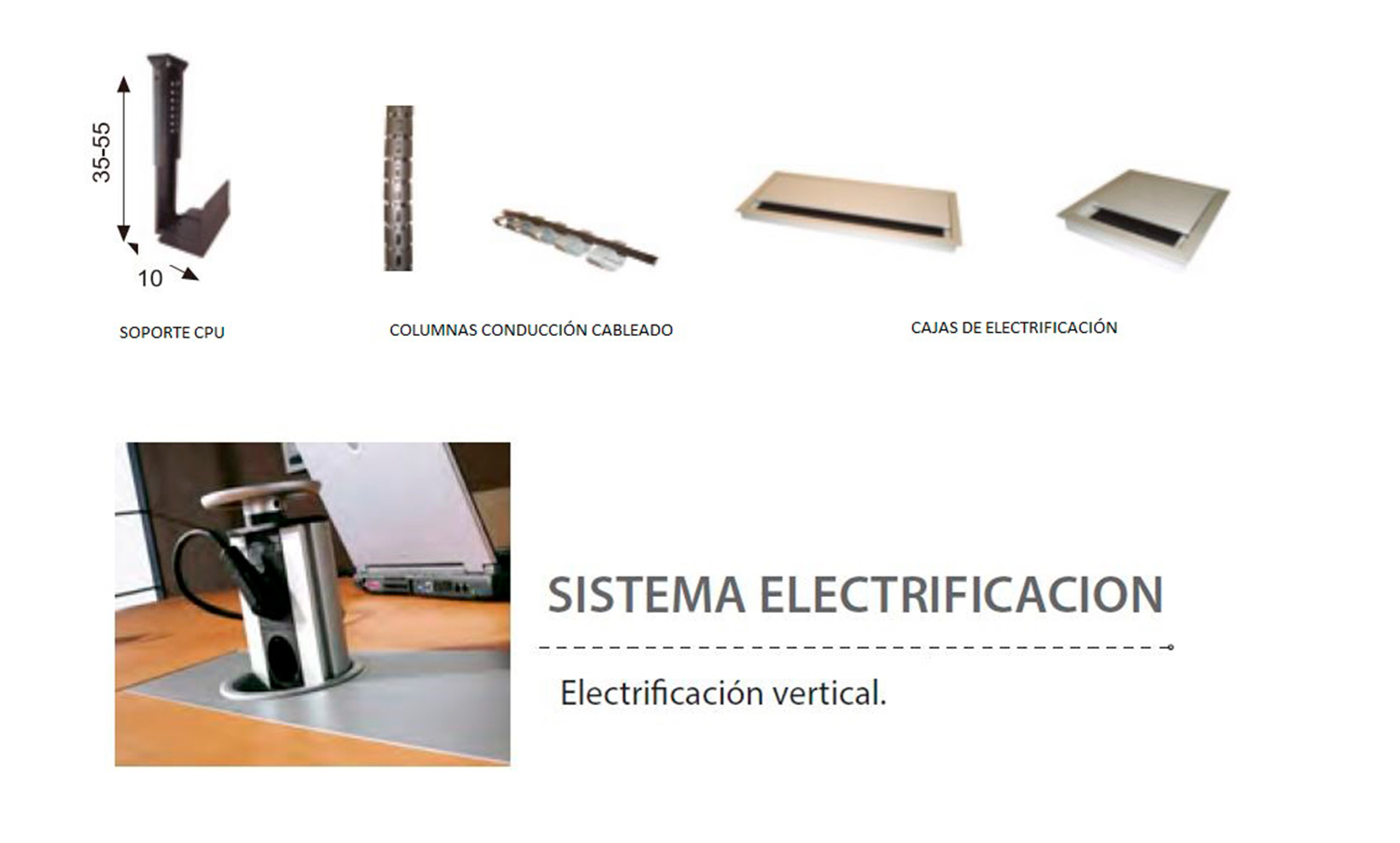LARGUERO METÁLICO: Esta formado con chapa metálica laminada en frío de 2 mm de grosor doblada y soldada para formar un perfil en “U” de gran resistencia a la flexión y torsión. Dispone de unas ranuras en cada uno de sus extremos que permiten la regulación de su longitud. Su interior tiene también la función de camino para cables que permiten la electrificación de la mesa. En su interior se pueden alojar distintos elementos como bases “schuko”. Recubierto con pintura epoxi-poliéster con espesores comprendidos entre 60 y 100 micras.
