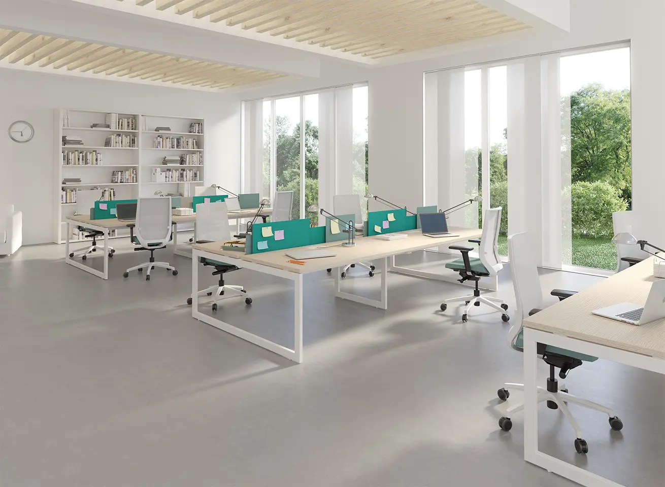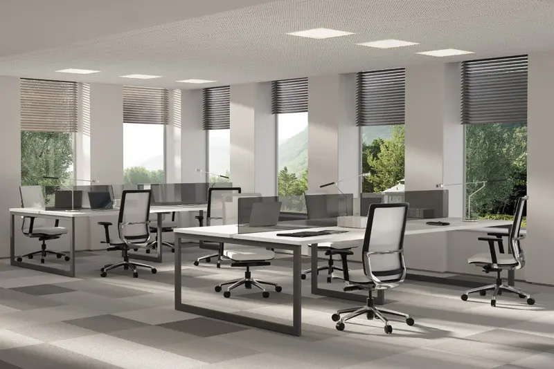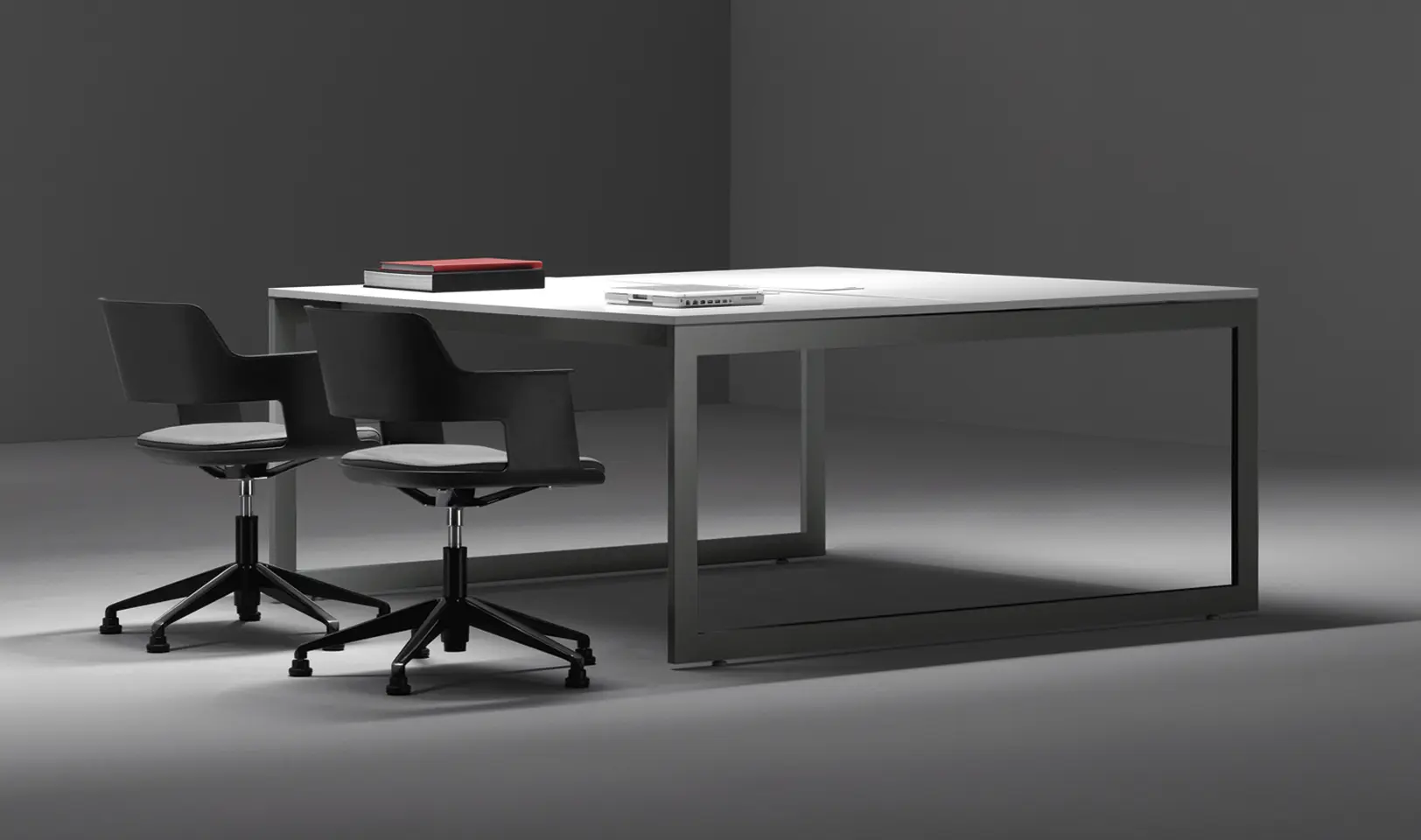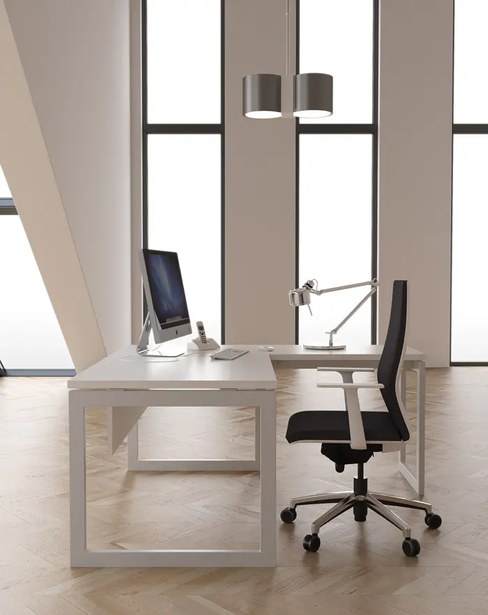 Tubo de acero de 60 x 30 x 2 mm cortado y soldado a inglete formando un rectángulo. Vigas de 60 x 30 x 1,5 mm como soporte de la tapa. Pintado con pintura epoxi con una capa de 100 micras. Este programa incorpora tres tipos de pórticos: simple (para mesas individuales), doble (para benchs) y de continuidad (para benchs). Este último aporta la solución al crecimiento longitudinal y, al ser más corto que el lado del bench donde se instala, facilita la distribución de los puestos de trabajo.