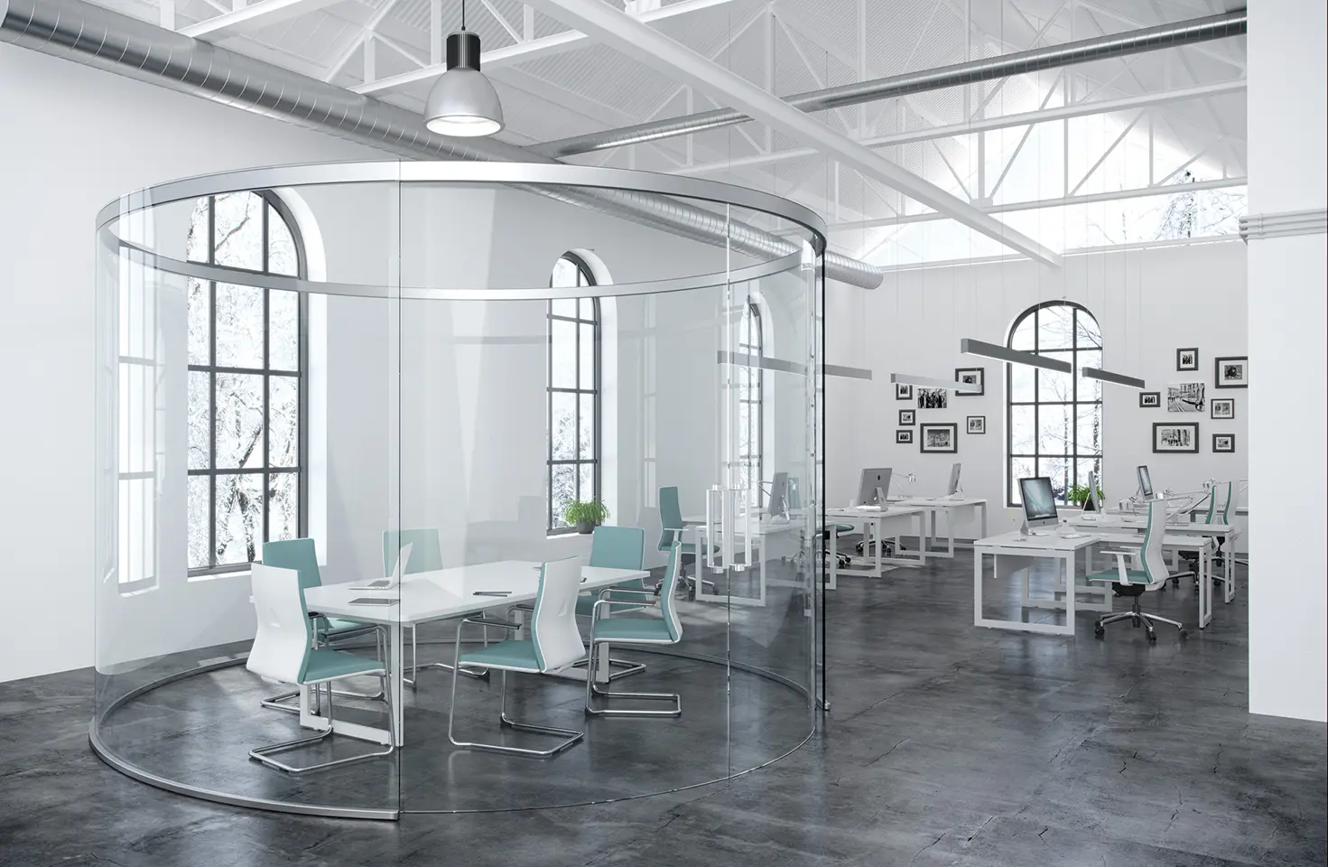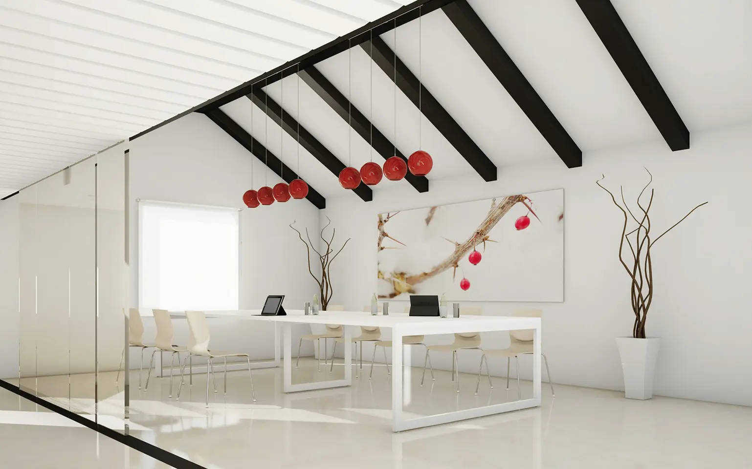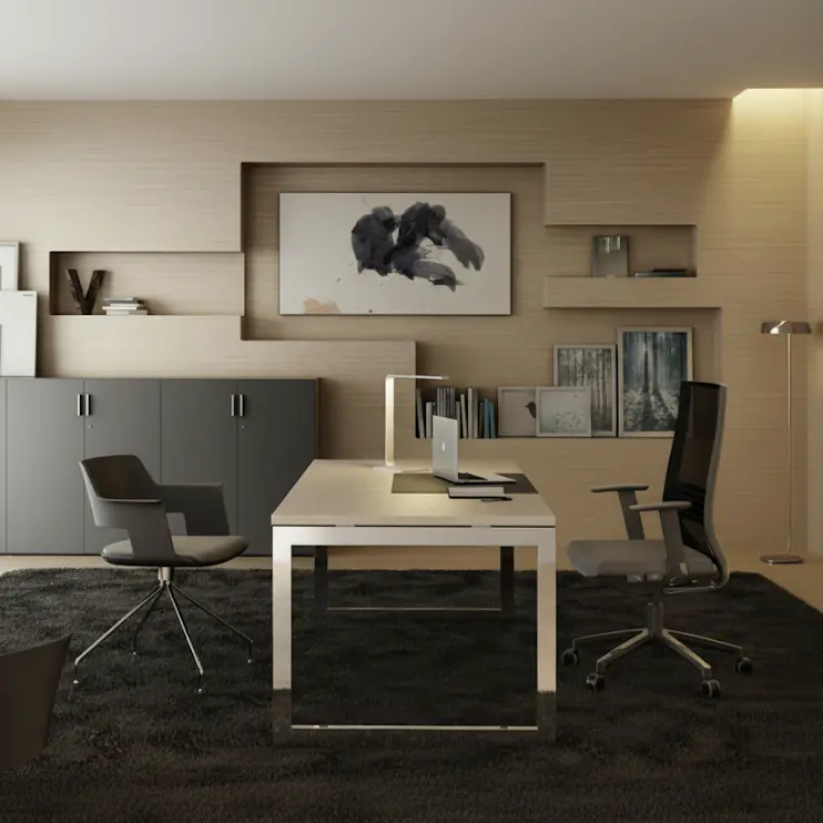 Tubo de acero de 60 x 30 x 2 mm cortado y soldado a inglete formando un rectángulo. Vigas de 60 x 30 x 1,5 mm como soporte de la tapa. Pintado con pintura epoxi con una capa de 100 micras. Este programa incorpora tres tipos de pórticos: simple (para mesas individuales), doble (para benchs) y de continuidad (para benchs). Este último aporta la solución al crecimiento longitudinal y, al ser más corto que el lado del bench donde se instala, facilita la distribución de los puestos de trabajo.