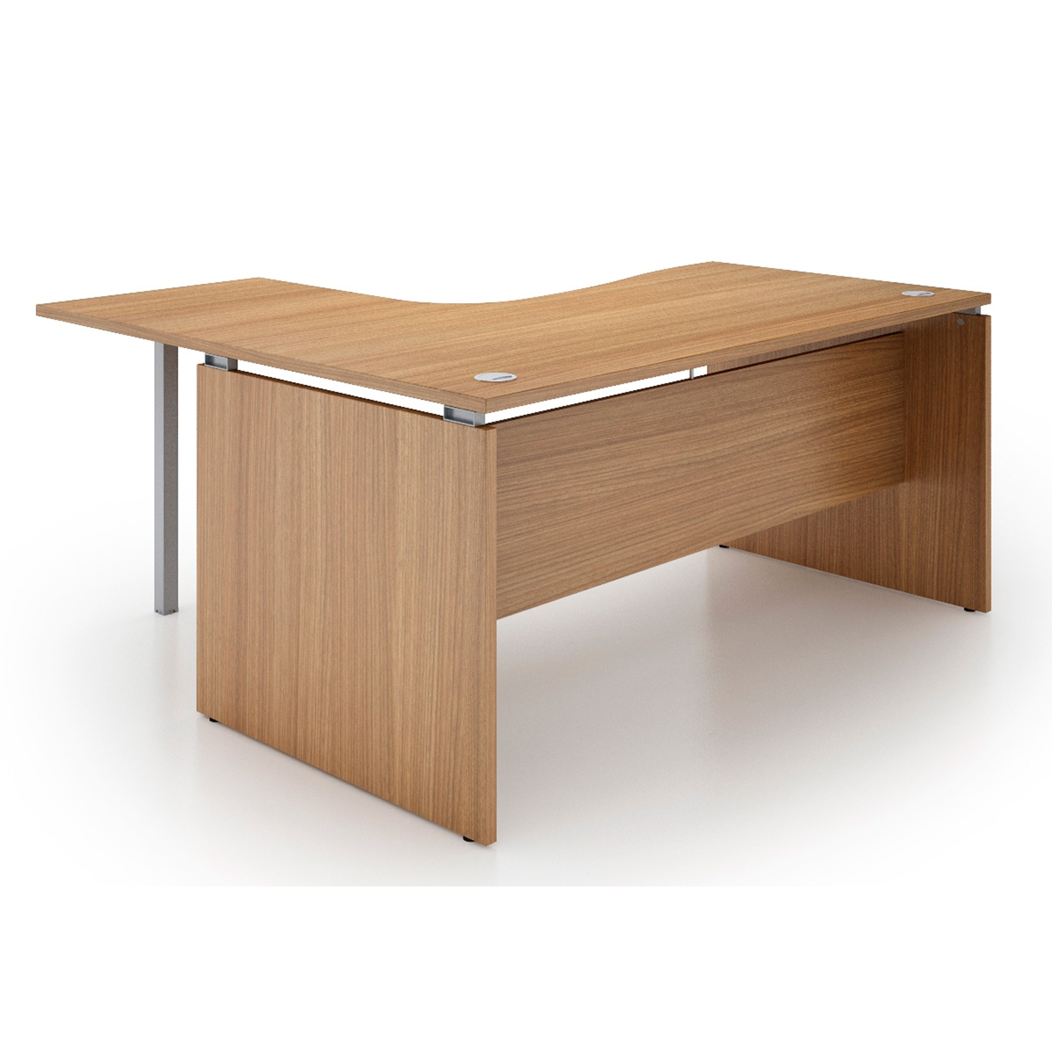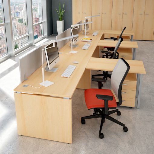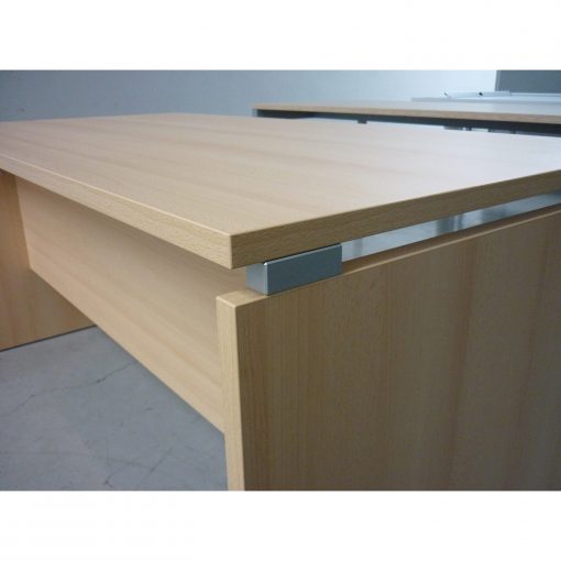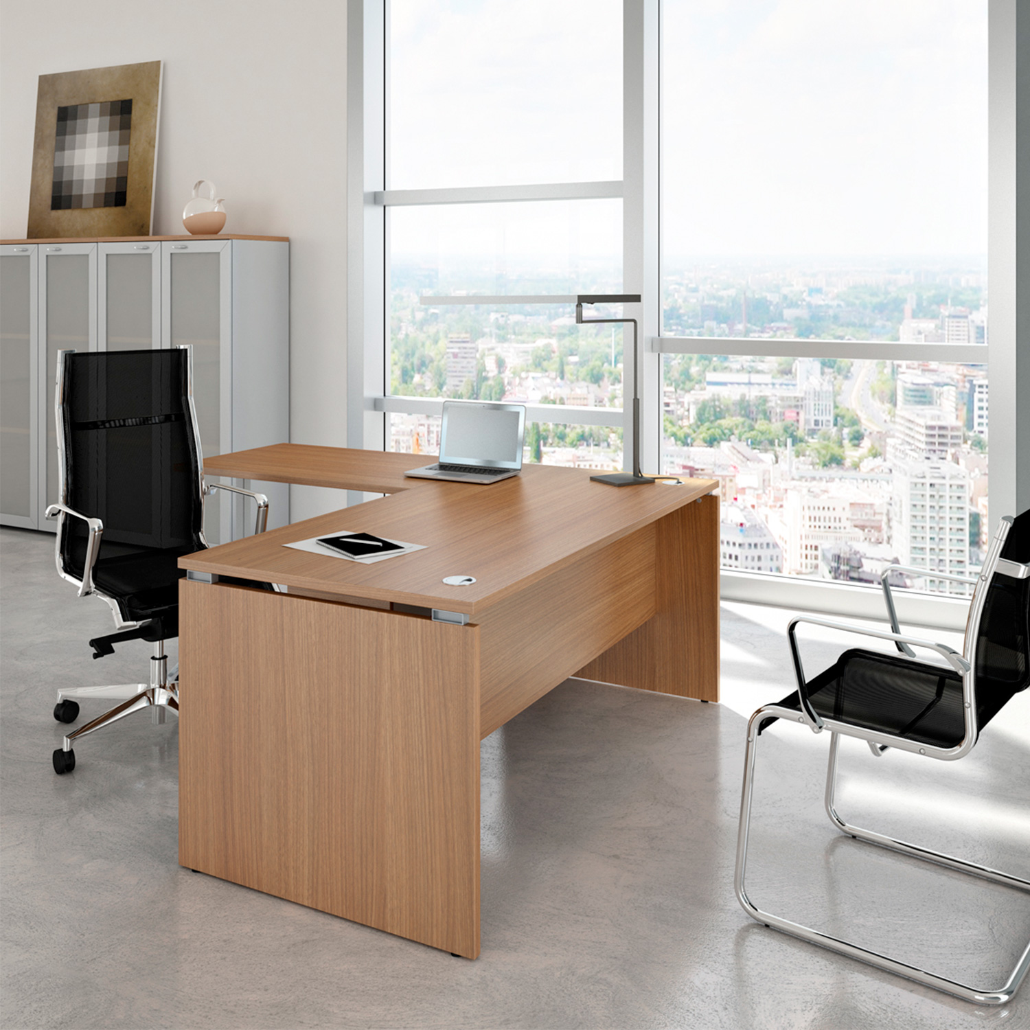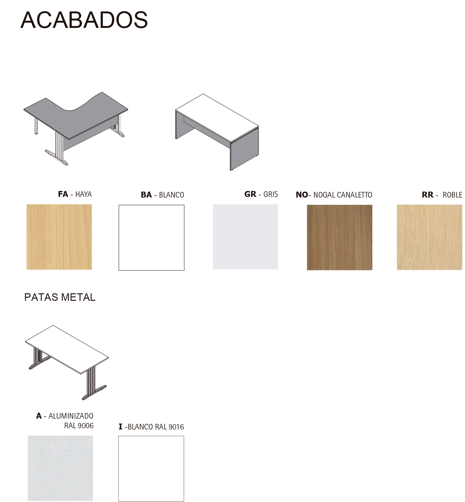 De fácil limpieza, antireflejos y antiarañazos están disponibles en 5 acabados, 3 lisos (blanco, gris y haya) y 2 con poro (roble y nogal canaletto). Las patas se unen entre si mediante un faldón estructural realizado en tablero de aglomerado recubierto por melamina, de 18 mm. de espesor (de fácil limpieza, antireflejos y antiarañazos), a juego con el sobre y con las patas.