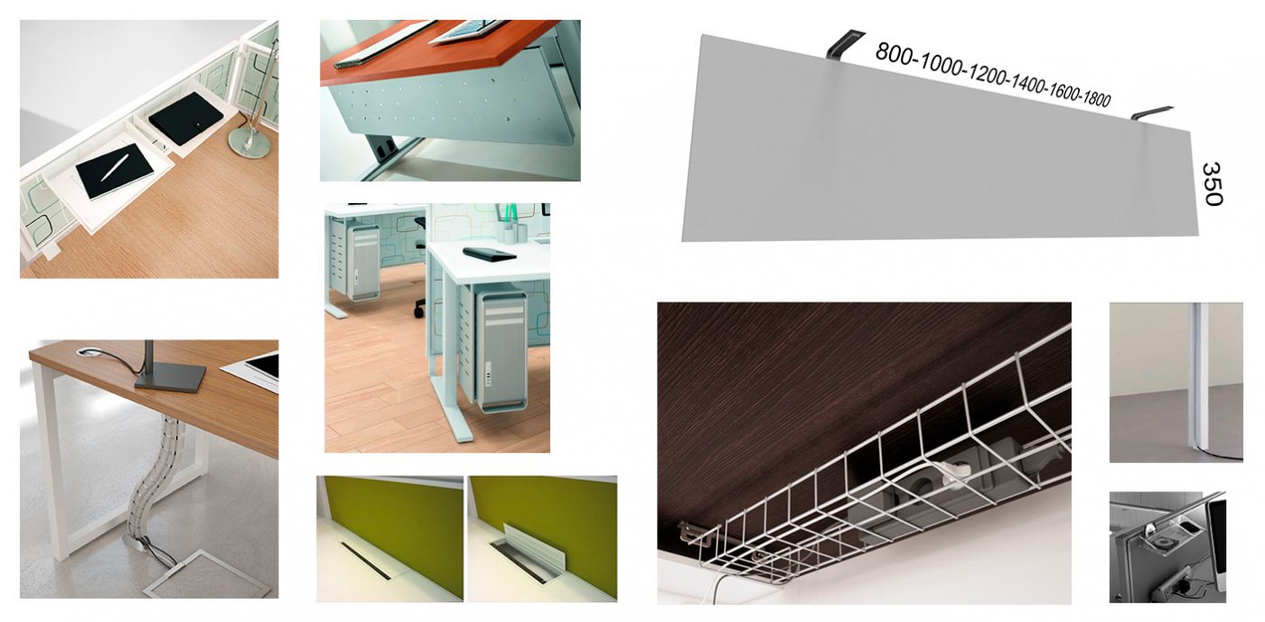 En las mesas individuales es posible instalar separadores de 440 mm. de alto que se sujetan mendiante dos pinzas metalicas en forma de “C” que se montan directamente en el sobre de la mesa. Los separadores están realizados en tablero de aglomerado recubierto por melamina, de 25 mm de espesor, con cantos antigolpes de ABS de 2 mm. de espesor, acabados a juego con el sobre.