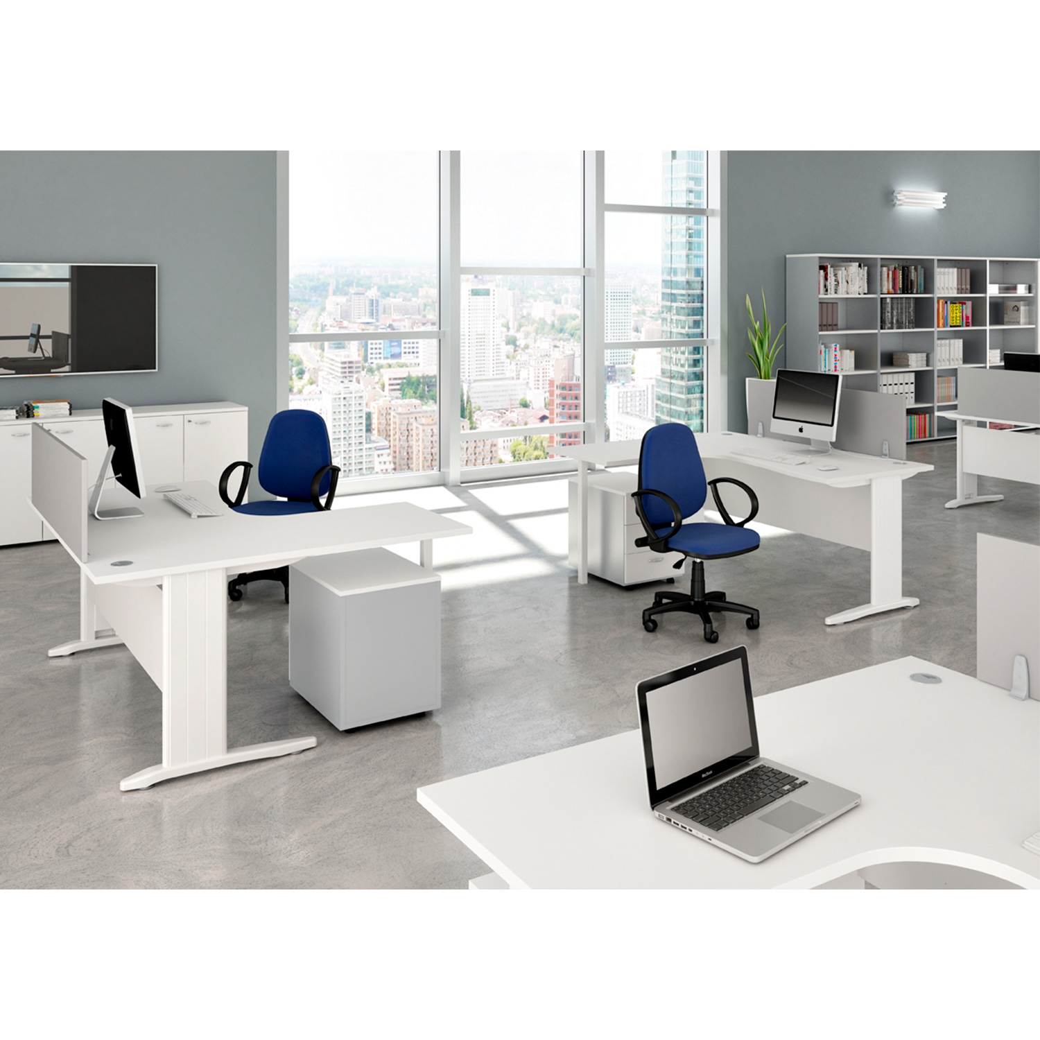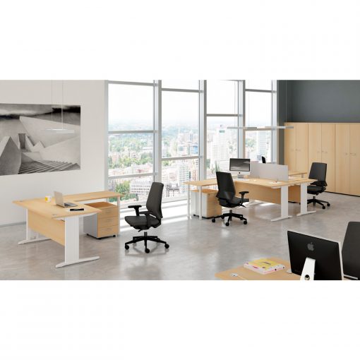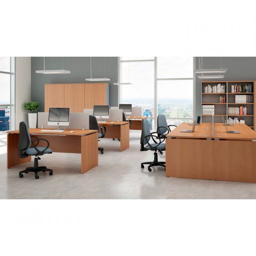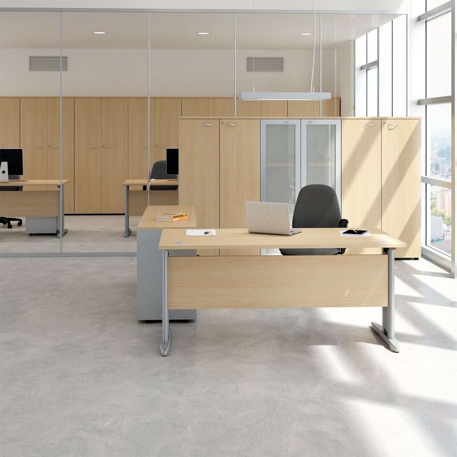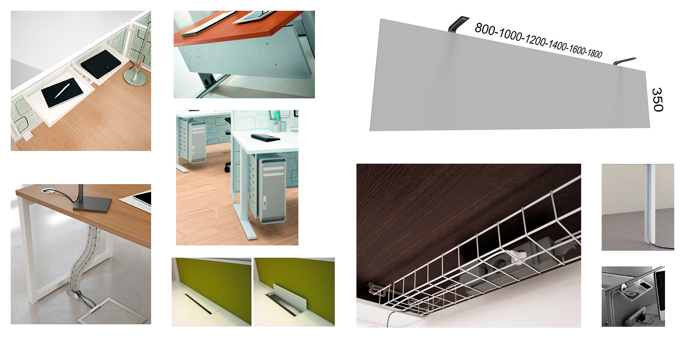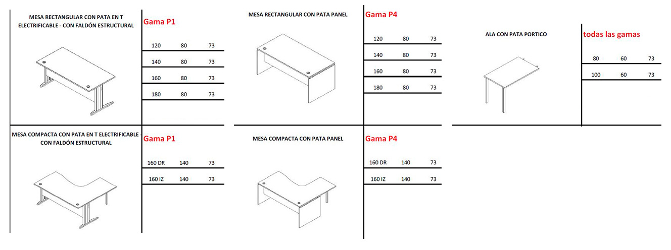 Para la unión de las patas entre si. la gama ofrece un faldón estructural realizado en tablero de aglomerado recubierto por melamina, de 18 mm. de espesor (de fácil limpieza, antireflejos y antiarañazos).