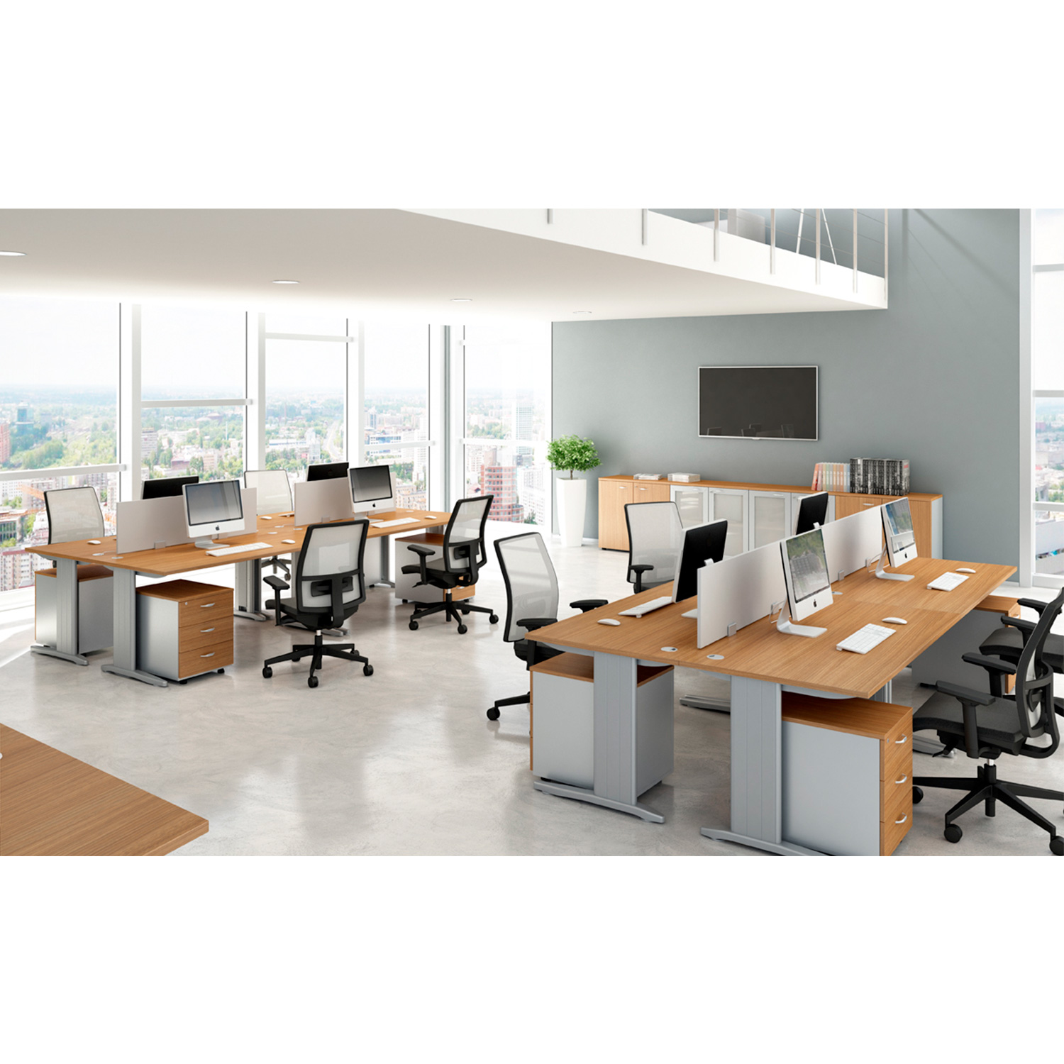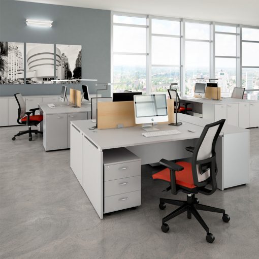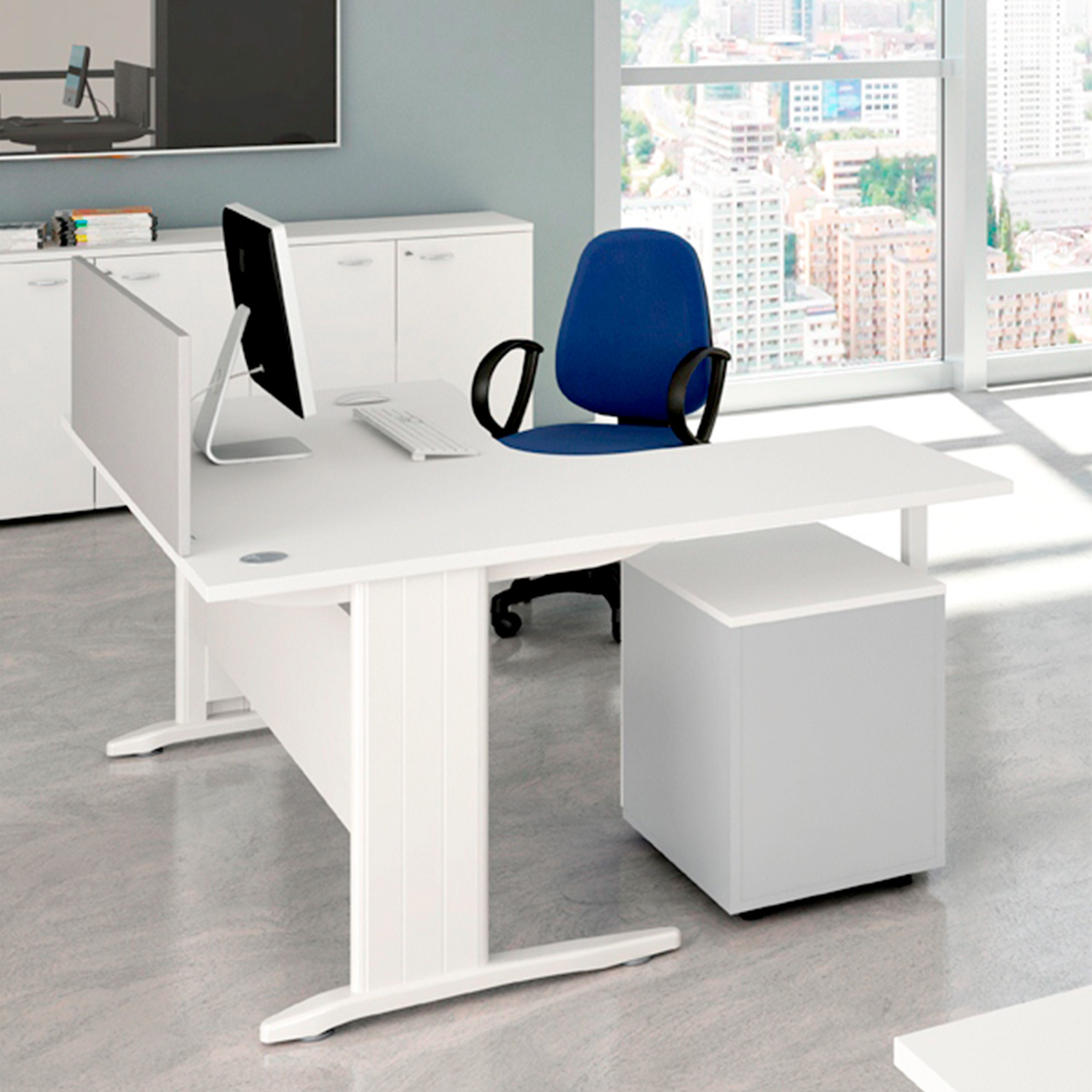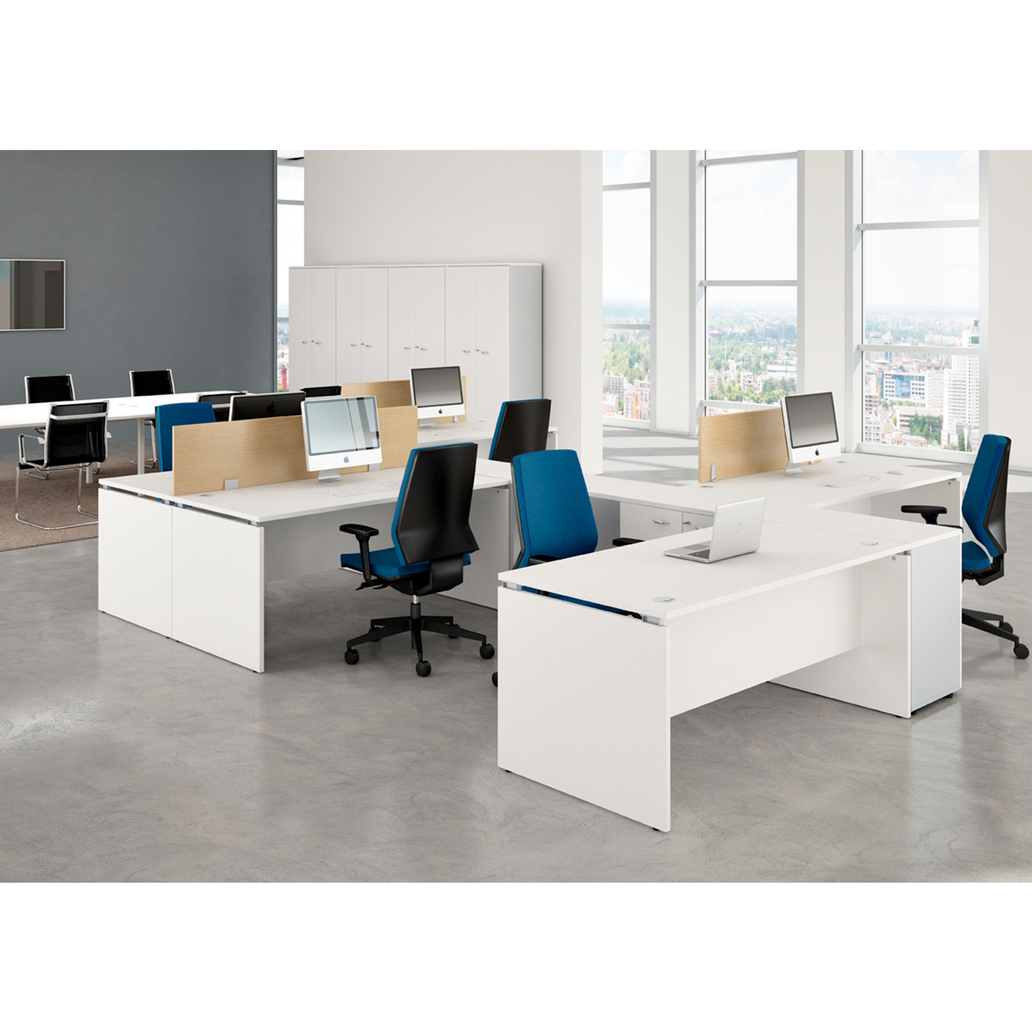 En las mesas enfrentadas (bench) P2 y P3 se pueden instalar separadores de 32 cm. de alto de melamina o tapizados. Los separadores se sujetan mediante dos pinzas en forma de “U” instaladas directamente en los sobres de mesas que vienen mecanizados en la parte inferior. Los separadores de melamina están realizados en tablero de aglomerado recubierto por melamina de 18 mm de espesor, con cantos antigolpes de ABS de 1,5 mm. de espesor, acabados en blanco o en aluminizado, de fácil limpieza, antireflejos y antiarañazos. La version tapizada es el mismo separador con una funda en tejido completo.