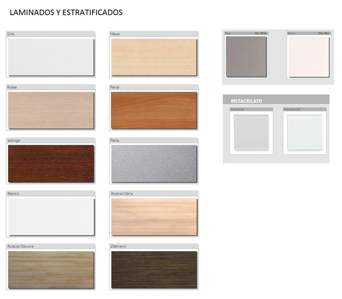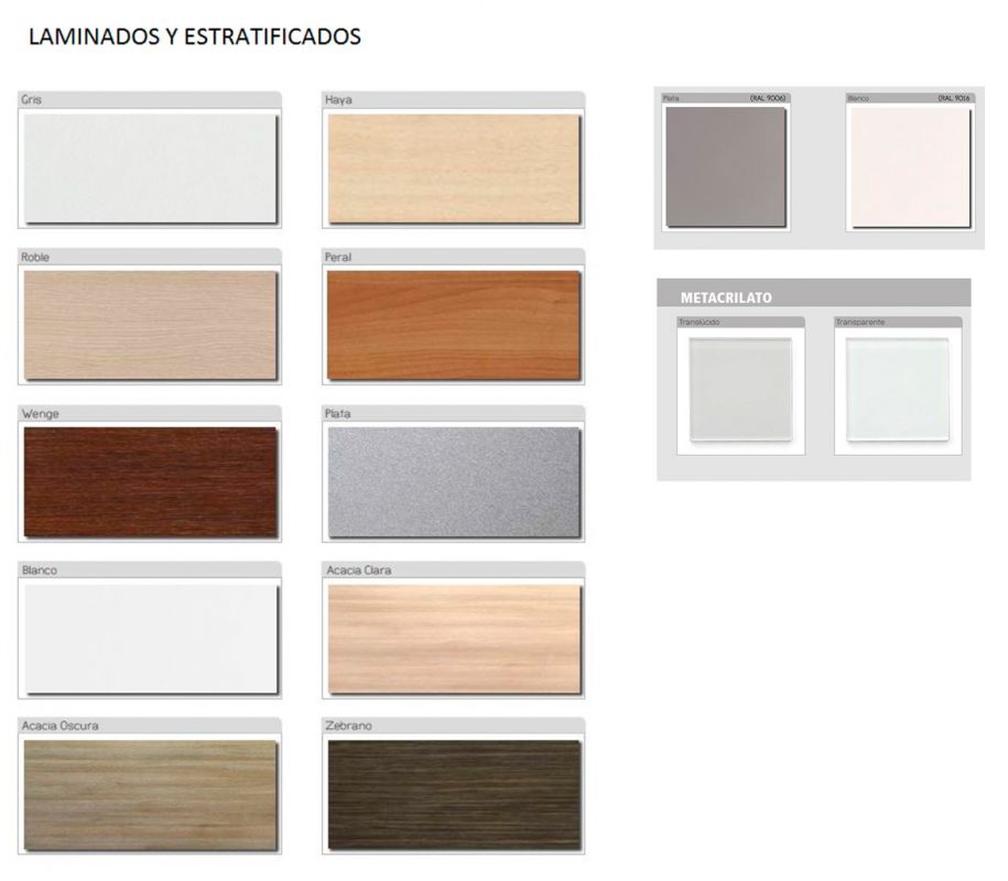 Gran variedad de acabados: Blanco, gris, haya, roble, peral, wengué, acacia clara, acacia oscura y zebrano.