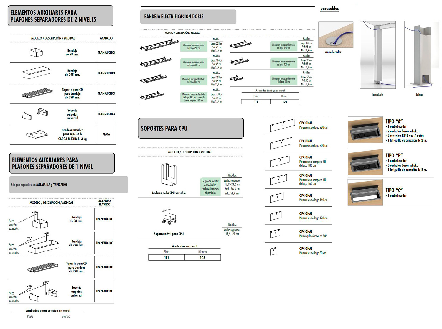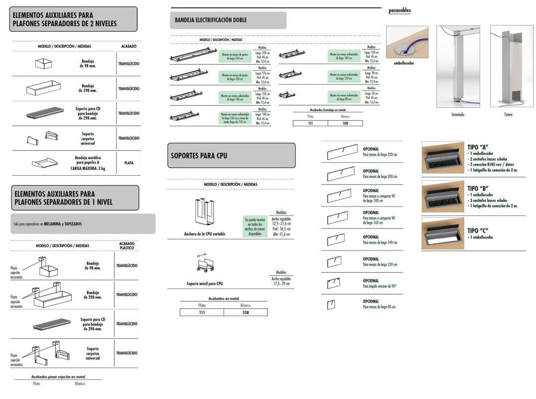 Acabados en pintura epoxi plata metalizada (ral 9006) o blanco texturado (ral 9016). Conteras de plástico ABS en la parte inferior del lateral para la ubicación de los niveladores con rosca métrica 8 y altura útil de 2 cm.