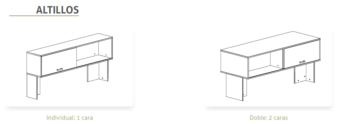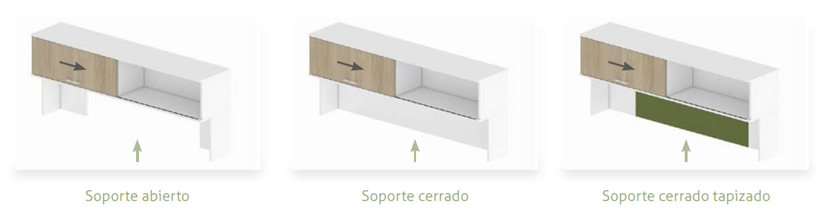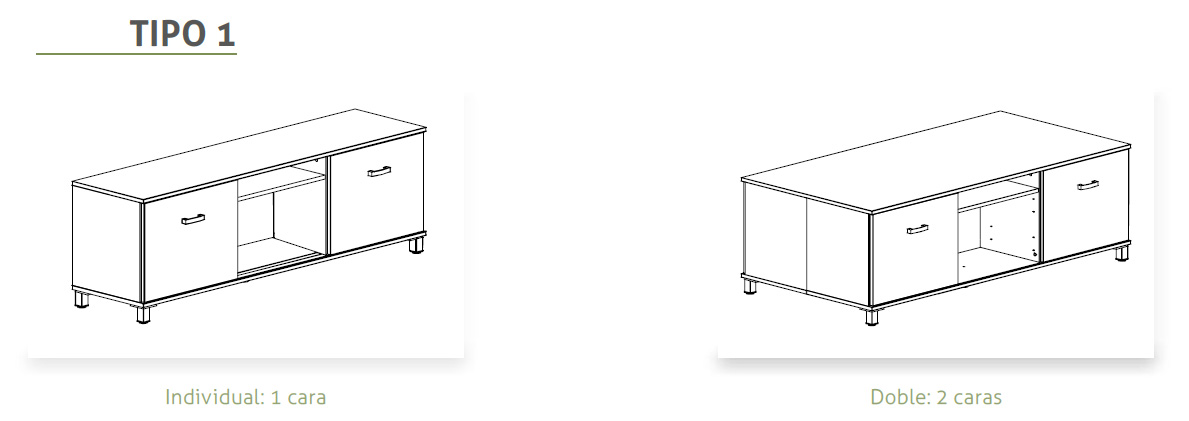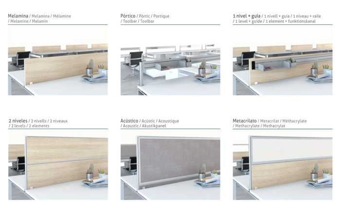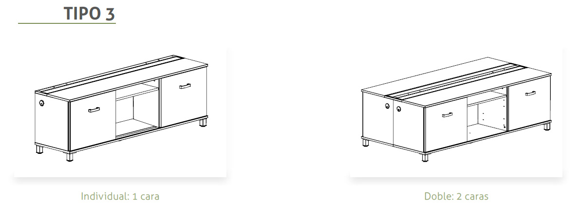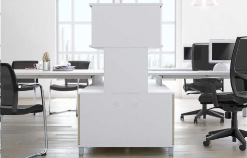 Incluye una o dos tapas abatibles y bandeja de electrificación integrada según sea de una cara o dos. Se accede desde la parte superior del mueble para facilitar el paso e instalación de cableado. Acabados de la tapa y la bandeja en pintura epoxi plata (RAL 9006), blanco (RAL 9016) o grafito (RAL 7022).