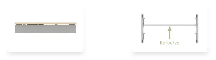 Refuerzos para unir los laterales: realizados con tubo rectangular de acero de 50 x 30 x 2 mm. Están provistos de piezas de aluminio en cada extremo preparadas para atornillar con tornillos M6. Acabado con pintura epoxi plata (RAL 9006).