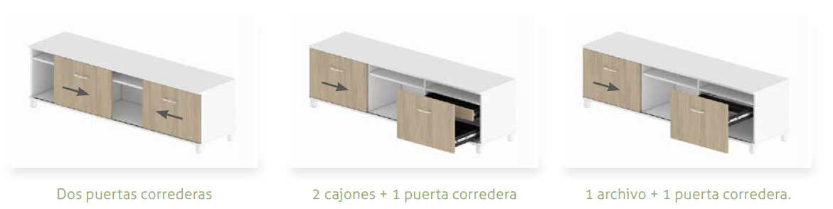 Acabados: blanco, gris, haya, roble, peral, wenge, acacia clara, acacia oscura o zebrano.