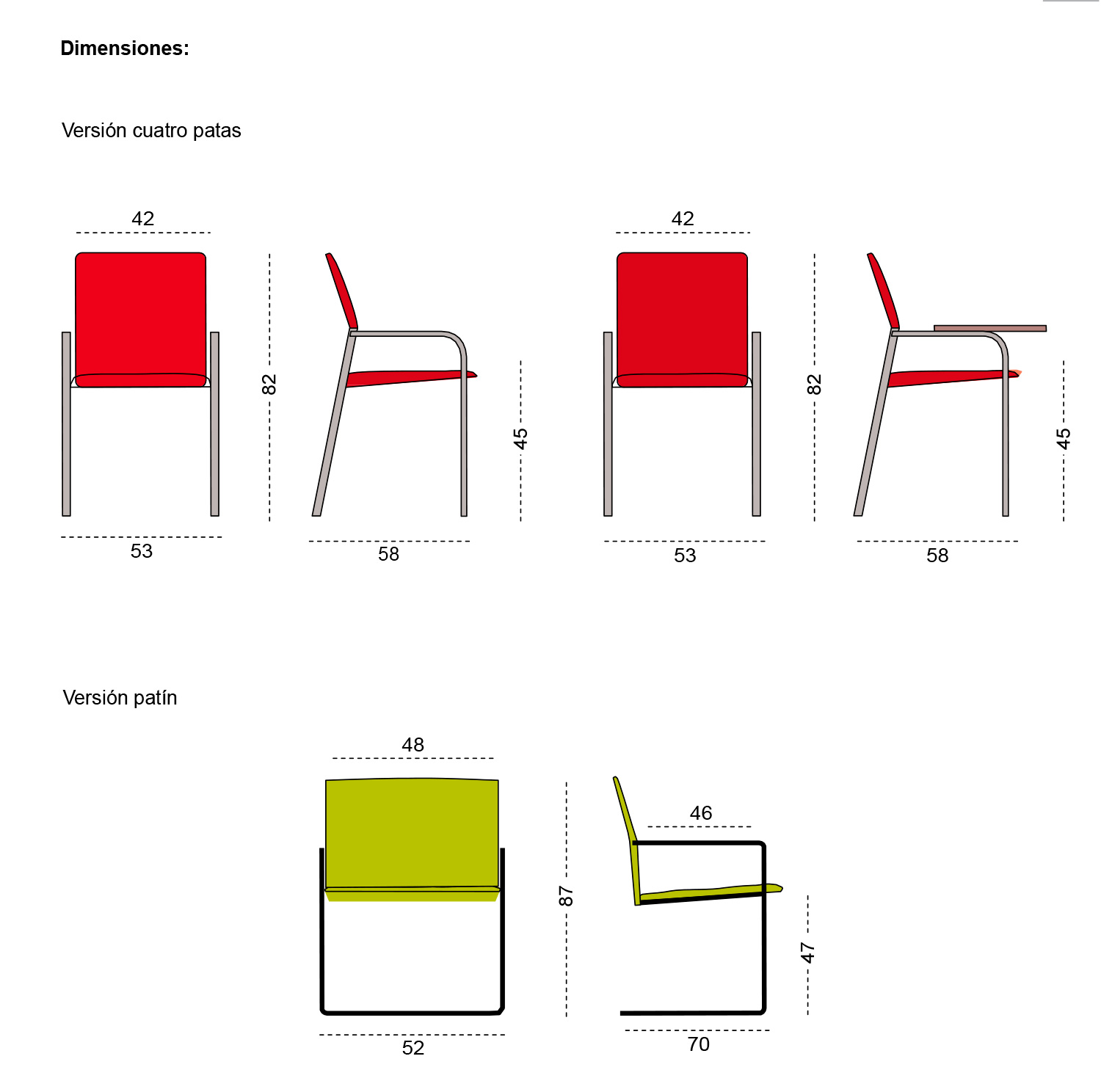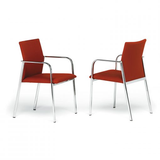 Los brazos son continuación de las patas delanteras, formando un único elemento, por el contrario, las patas traseras fabricadas con el mismo tubo, están giradas 90° para permitir un posterior apilamiento del conjunto.