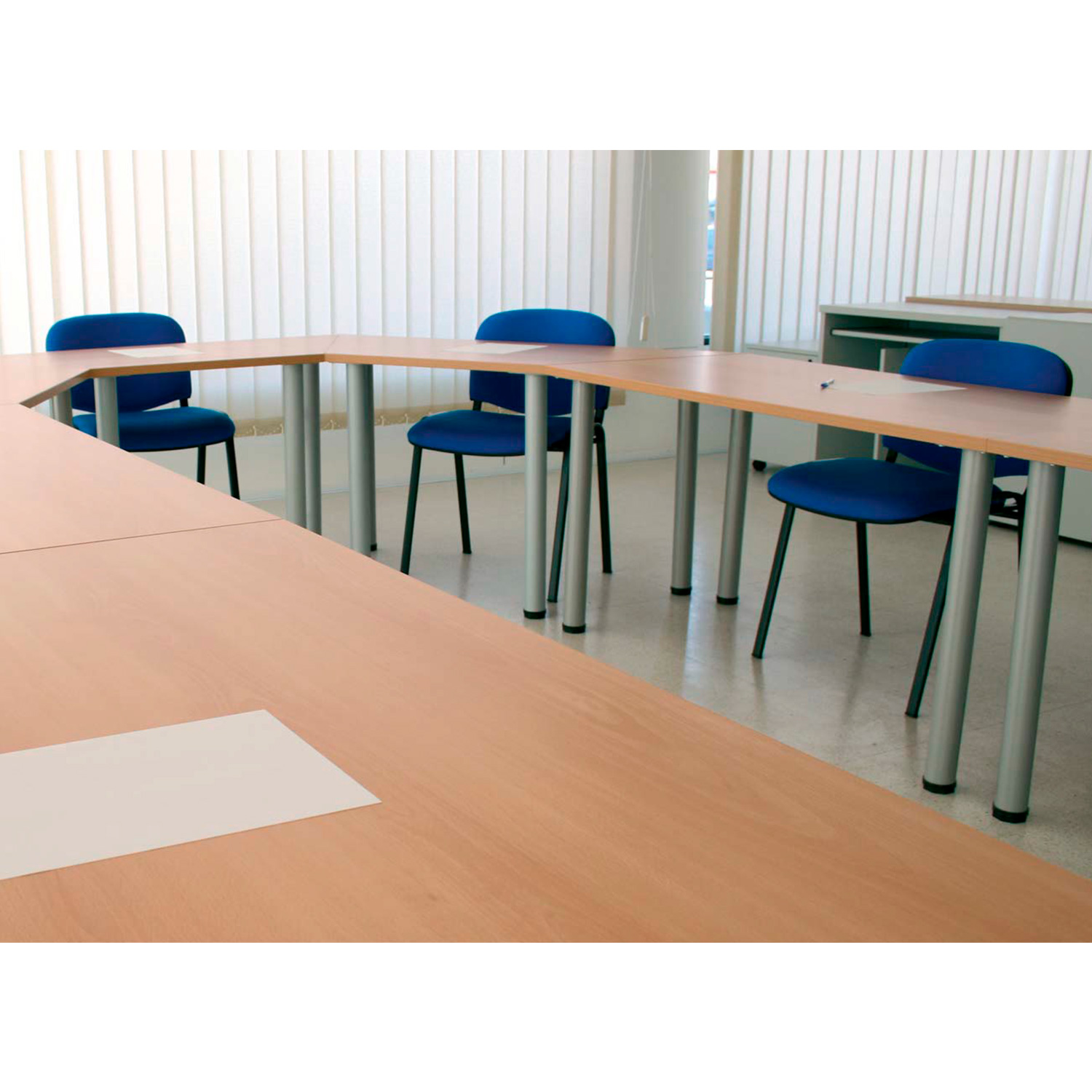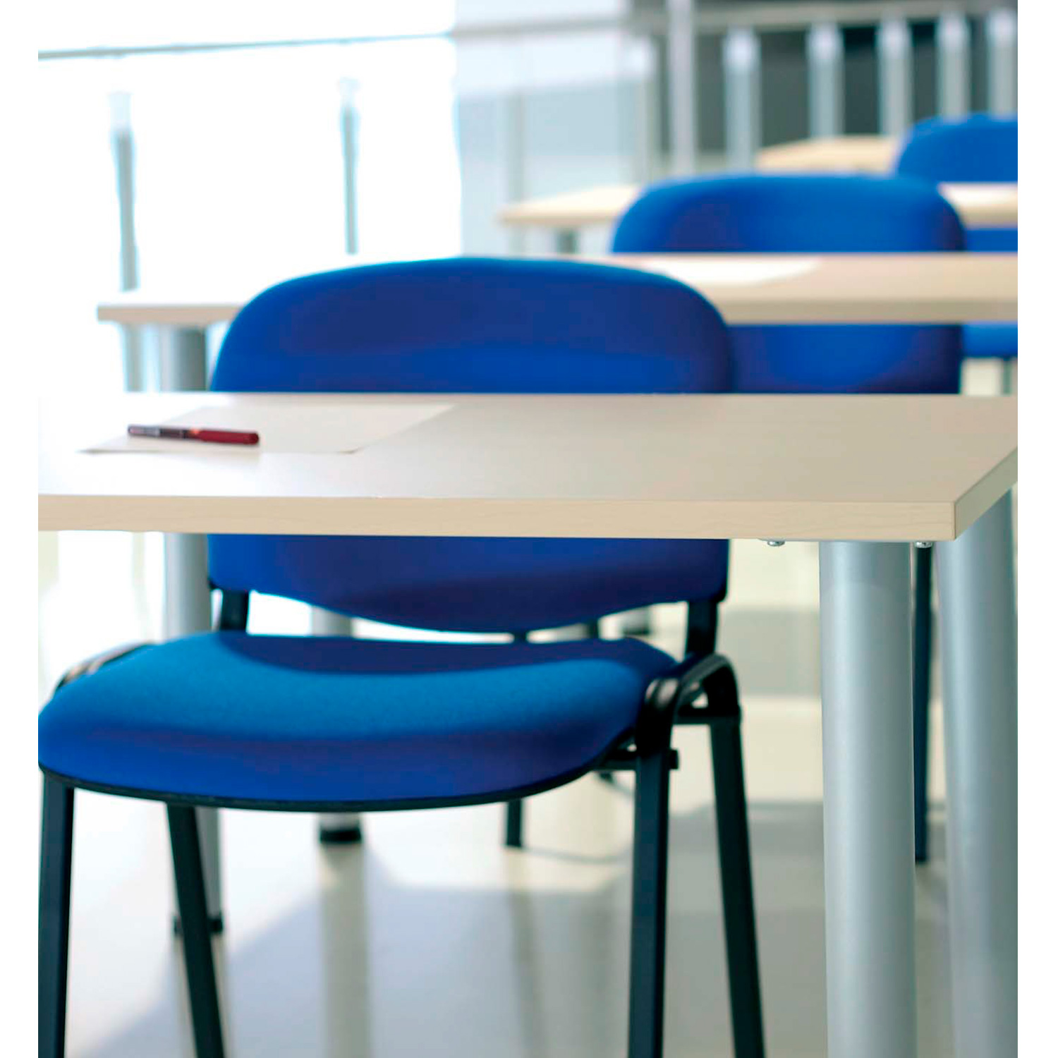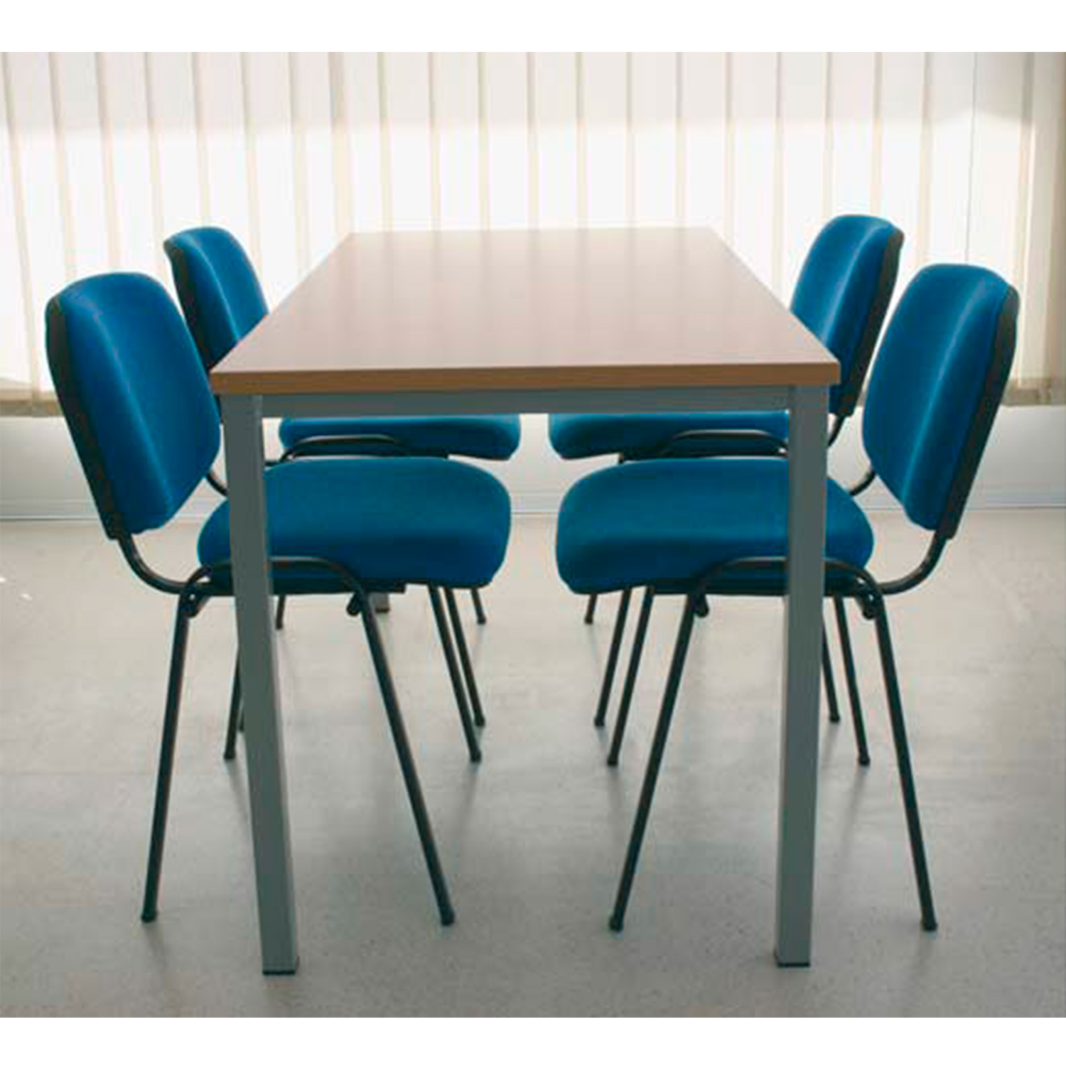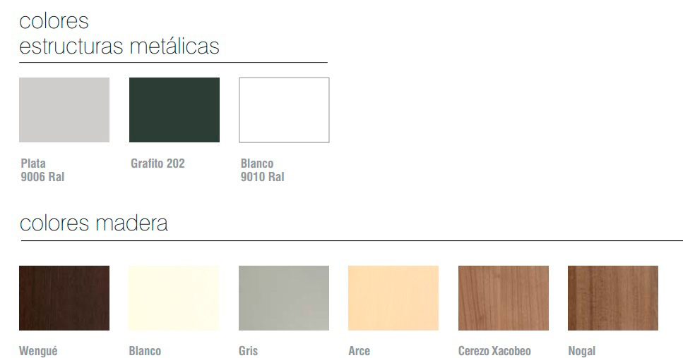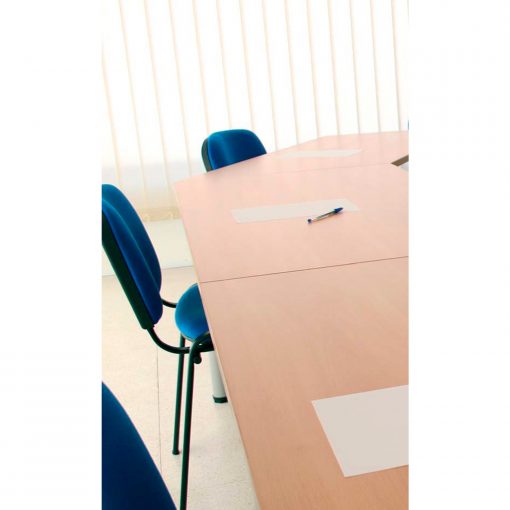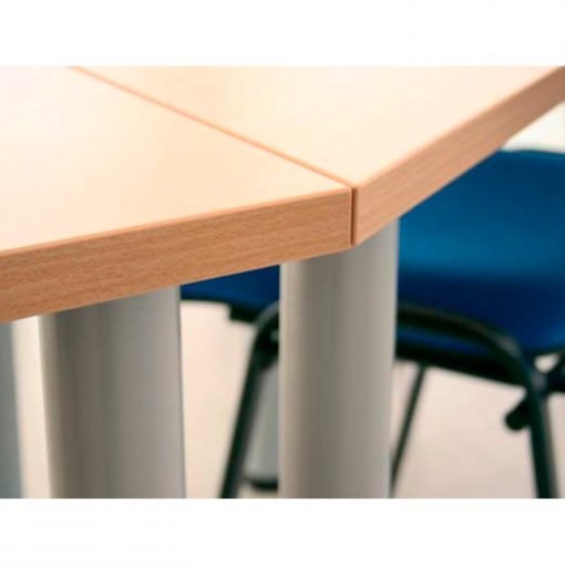 Mesas de estructura metálica soldada, fabricada con tubo cuadrado de 40×40 en las patas y marco perimetral de 30×30 ( u opción de patolas independientes diámetro 60 mm con ménsula de agarre), pintado con pintura epoxi color a elegir. Tablero de partículas de aglomerado de 25mm de espesor , papel decorativo a ambas caras. Canteado en ABS 2mm de espesor.