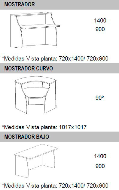 Mostradores modulares fabricados con tablero aglomerado laminado a ambas caras, canteado con ABS de 2 mm en todos sus cantos. Los sobres de mostrador y trabajo son de 25 mm de espesor, mientras que los laterales y frontales son de 19mm.
