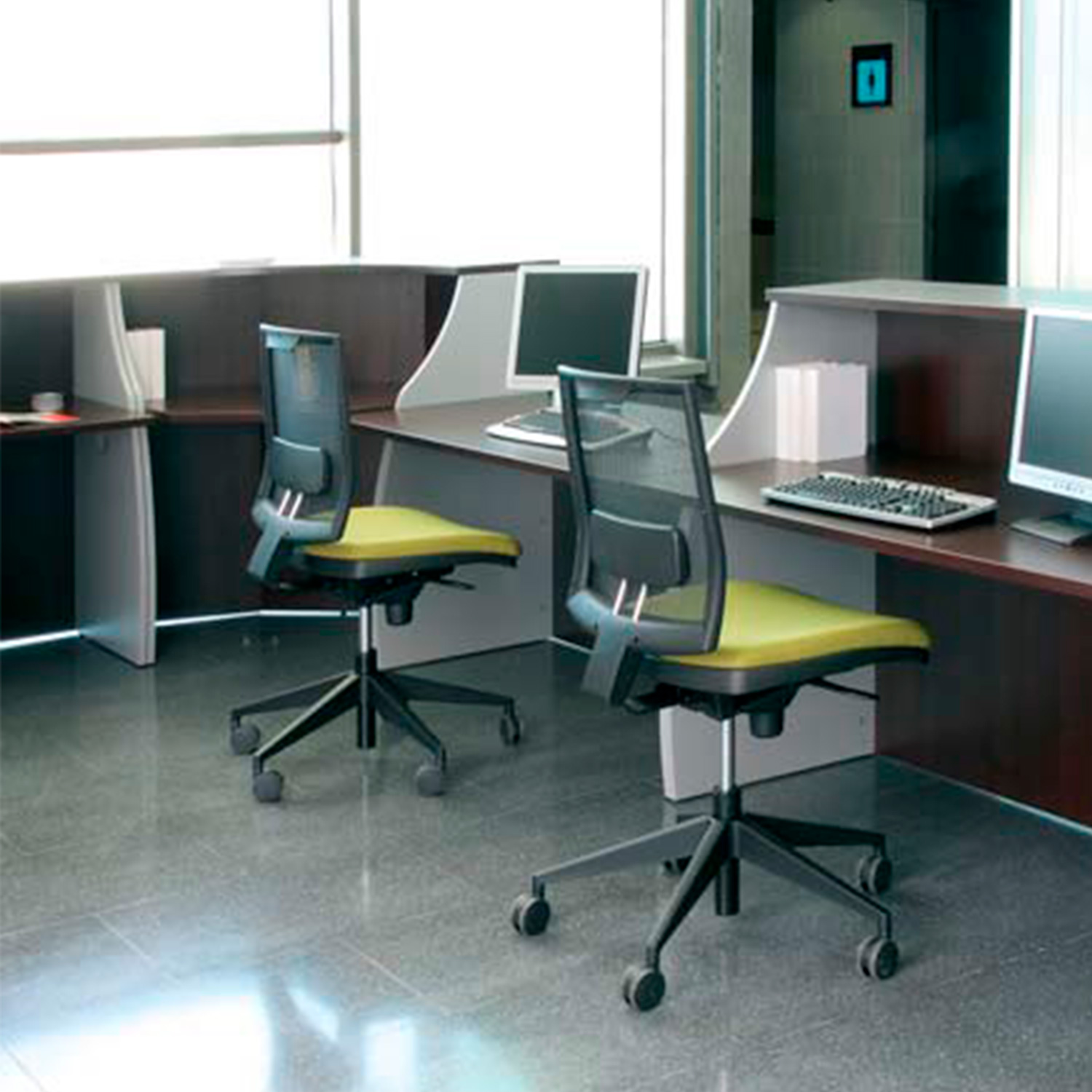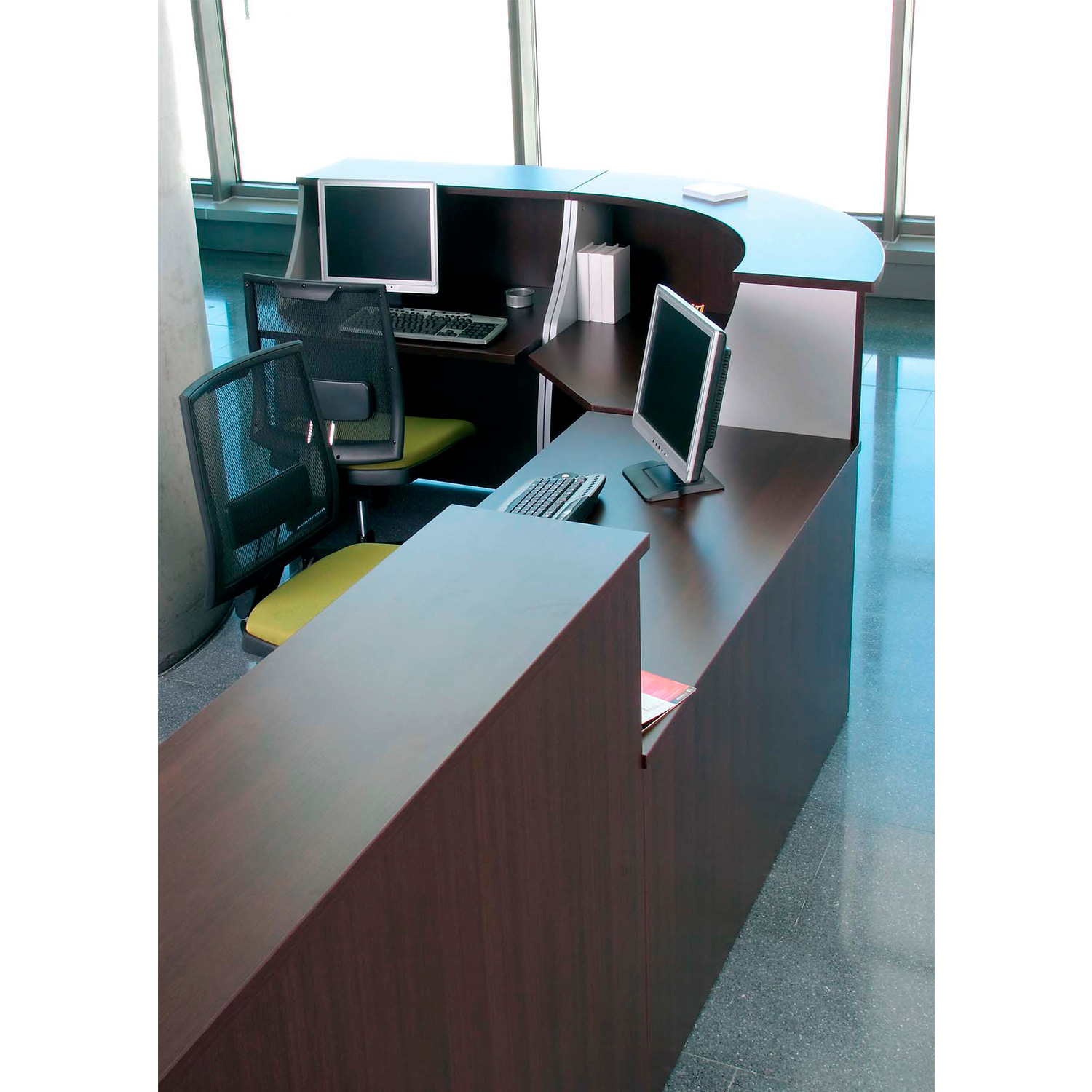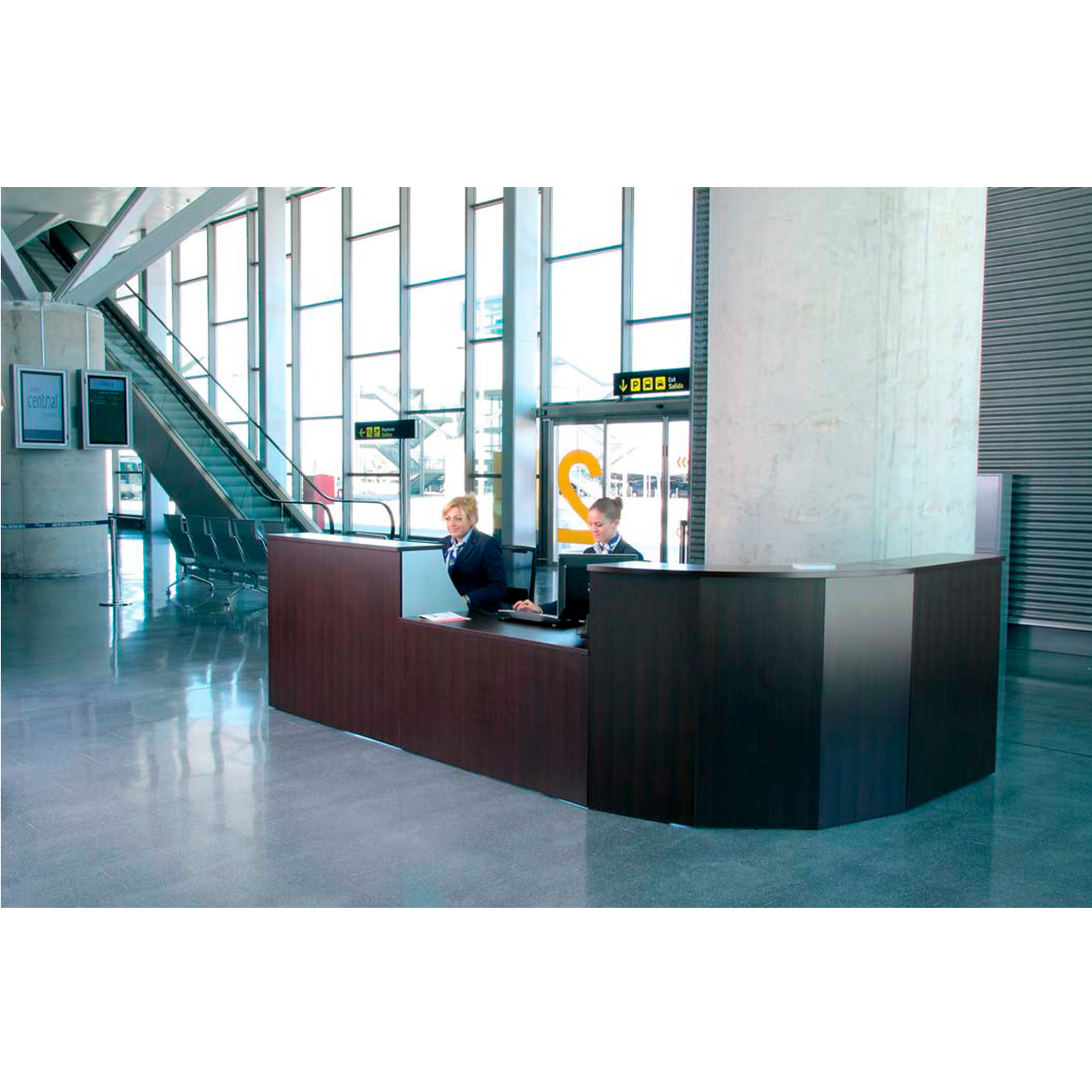 Mostradores modulares fabricados con tablero aglomerado laminado a ambas caras, canteado con ABS de 2 mm en todos sus cantos. Los sobres de mostrador y trabajo son de 25 mm de espesor, mientras que los laterales y frontales son de 19mm.