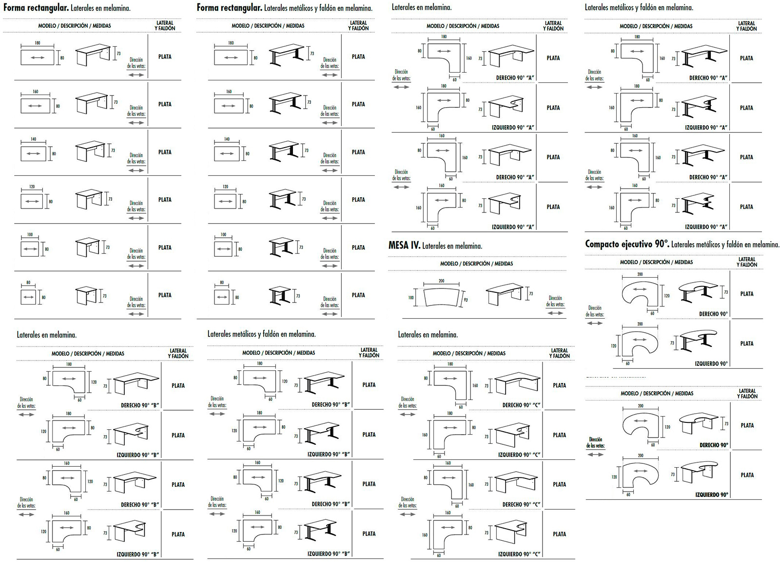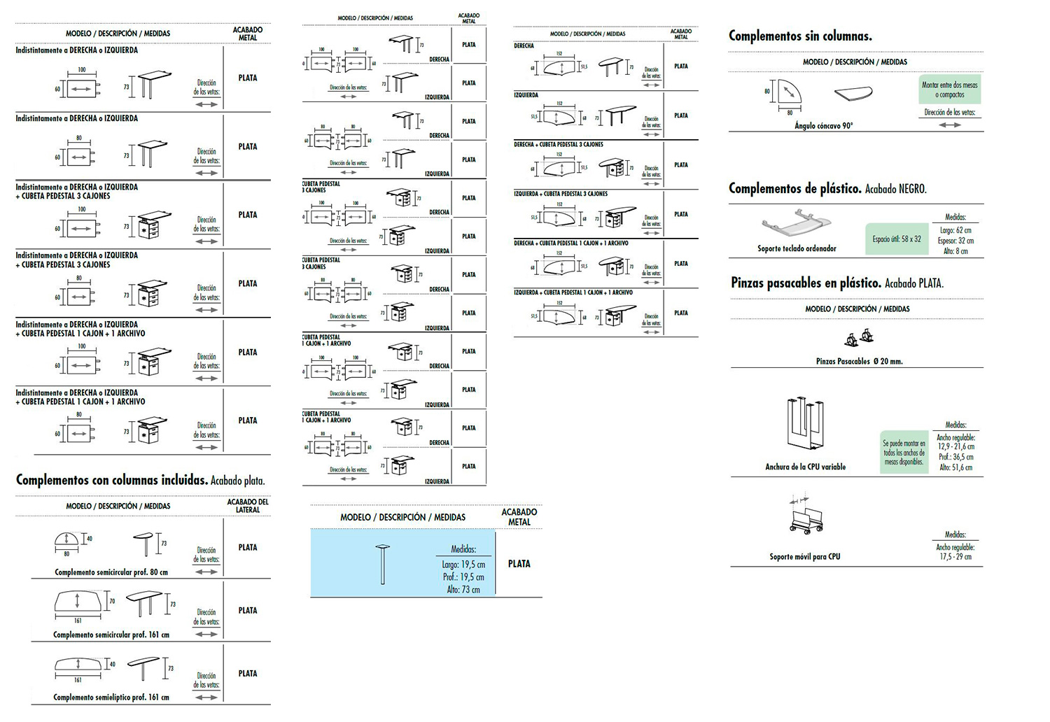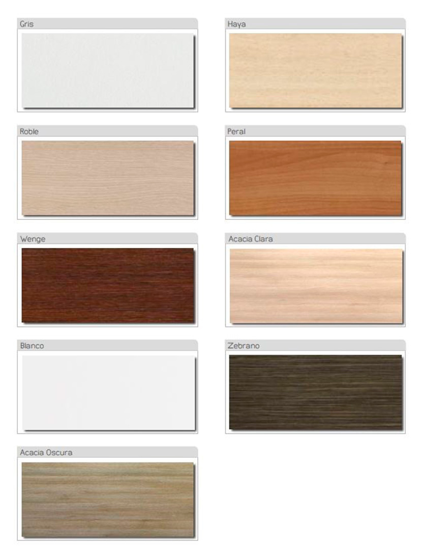 Gran variedad de acabados: Blanco, gris, haya, roble, peral, wengué, acacia clara, acacia oscura y zebrano.