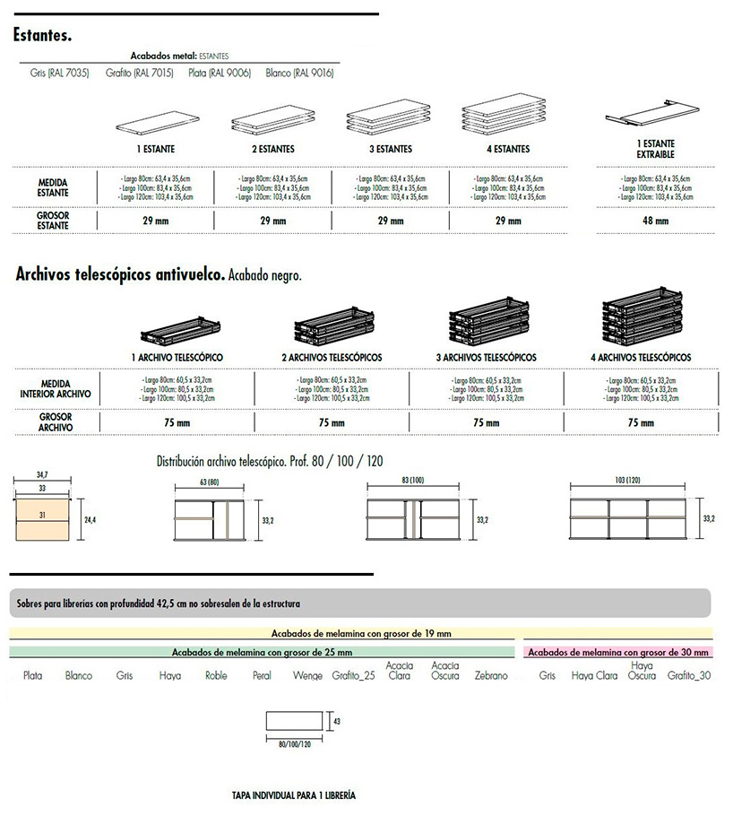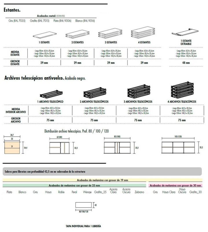 a) Múltiples lineales: hasta 3 librerías del mismo ancho (excepto los de 1200 que sólo pueden ser hasta 2). Fabricadas de melamina de 19 mm, 25 mm o 30 mm se colocan sobre la estructura metálica. Mismos acabados que las tapas individuales.