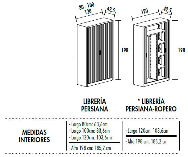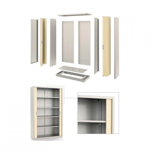 Laterales exteriores, sobre y bajo fabricados en chopo laminado en frío de 0,8 mm DC01 y 1.2 mm en zócalo, soporte niveladores y soporte caracola inferior. Laterales interiores fabricados en 0,8 mm, desmontables y unidos o la estructura mediante tornillería rosco chapa DIN 7982 zincado blanco. Bajos incluyen 2 refuerzos que actúan como soporte paro los niveladores regulables interiormente, paro un correcto asentamiento de lo librería al suelo. Librerías desmontadas (estructura unido mediante tornillería rosca chapa DIN 7982 zincado blanco).