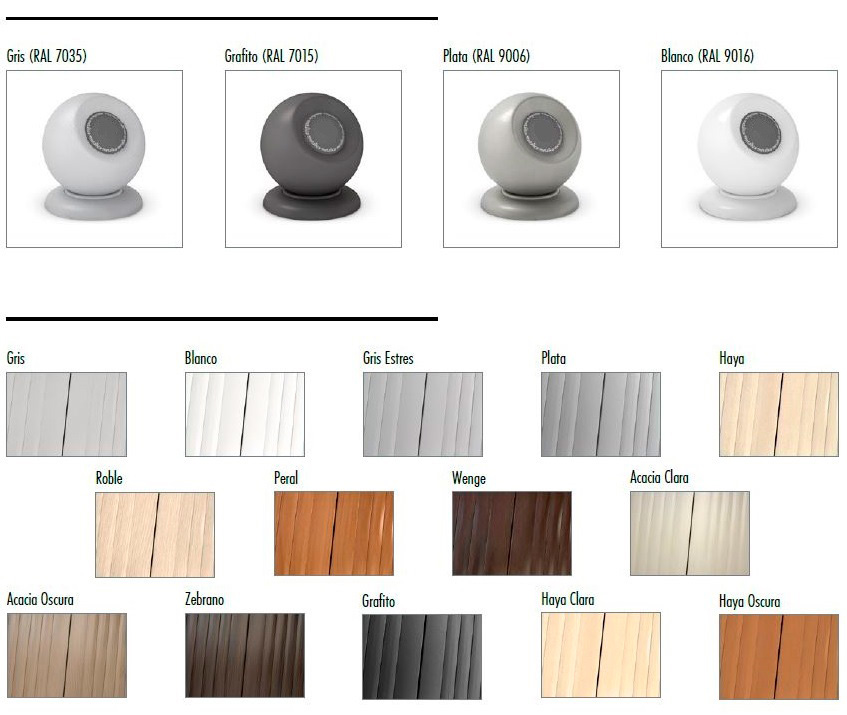 Persiana corredera fabricado en Perfilería de PVC que se desliza sobre guías fabricados en ABS. Acabados de persiano en plato, blanco, grafito, gris, hoyo, roble, perol, wenge, gris, haya claro, haya oscura, acacia claro, acacia oscuro y zebrano.