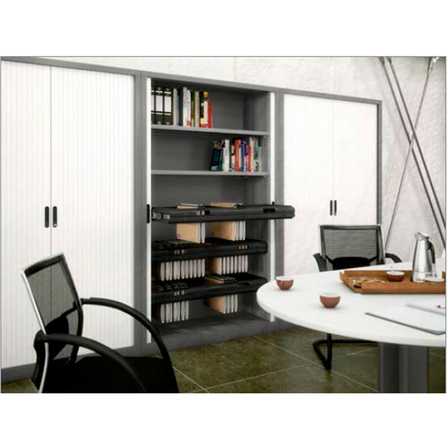Bastidores archivos fabricados en chapa laminada en frío de 0,8y 1,2 mm montados sobre guías telescópicas de extracción total que incluyen sistema de antivuelco. Acabados en pintura epoxi negro.