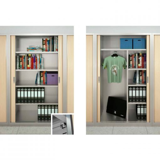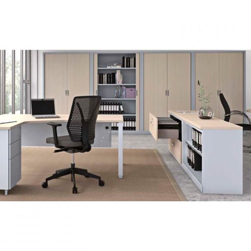 Estantes fijos fabricados en chapa laminada en frío de 0,8 mm DC10, grosor del estante 29 mm. Incluye en la parte inferior un soporte de carpetas A4 fijas.