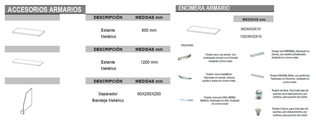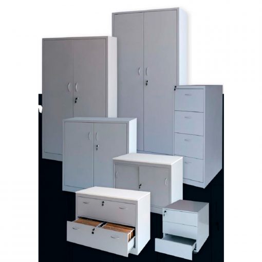 Armarios metálicos fabricados en chapa de acero de 0.8 mm de espesor, pulida y laminada en frio, proceso que dota al material de gran dureza y resistencia. Los armarios son desmontables con elementos unidos a la estructura mediante tornillo rosca-chapa.