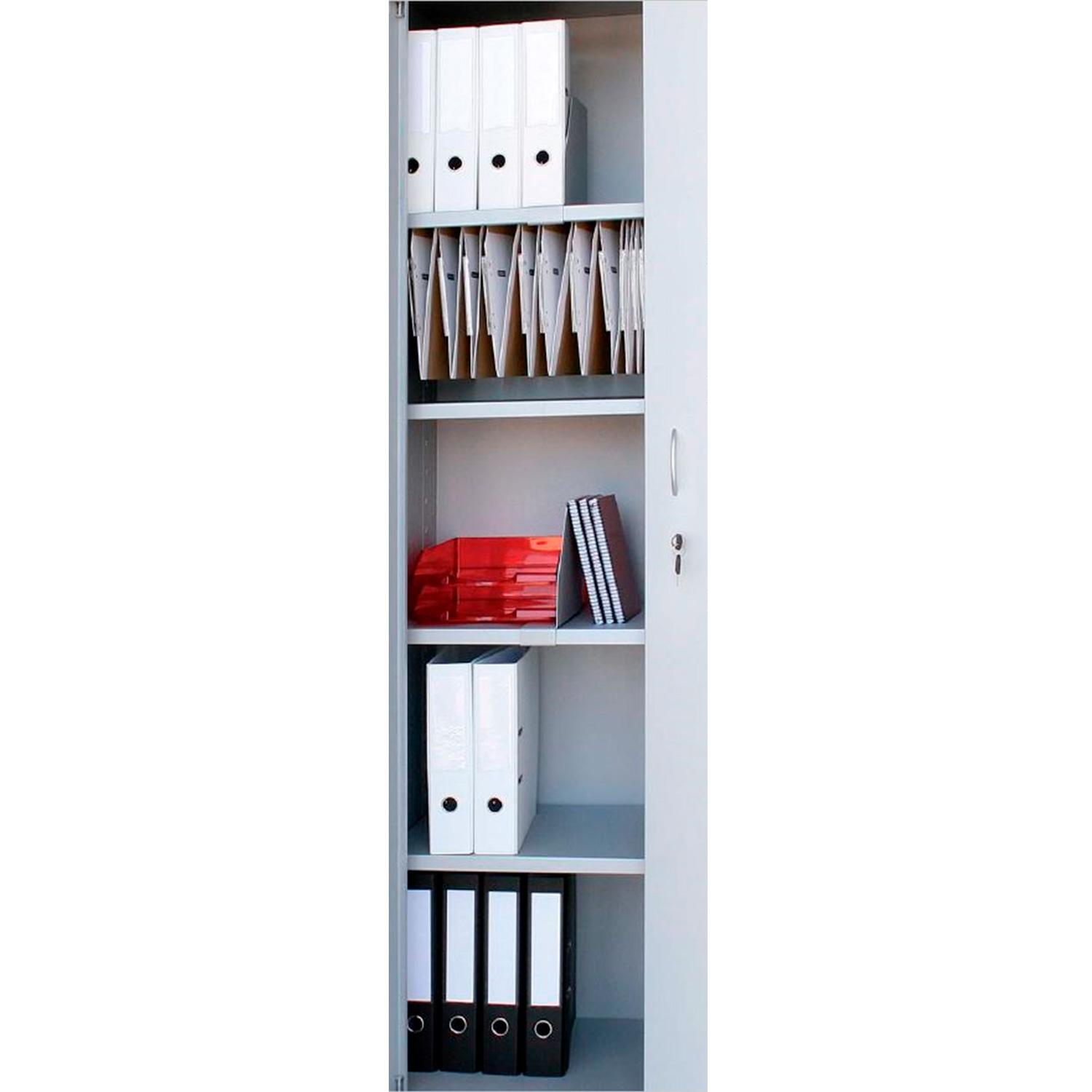 Los estantes están preparados para carpetas colgantes, de 34 cm, con el visor en la parte frontal de la carpeta. Dichas carpetas se cuelgan en la parte inferior del estante, en los pliegues anterior y posterior, para el máximo aprovechamiento del hueco en el armario.