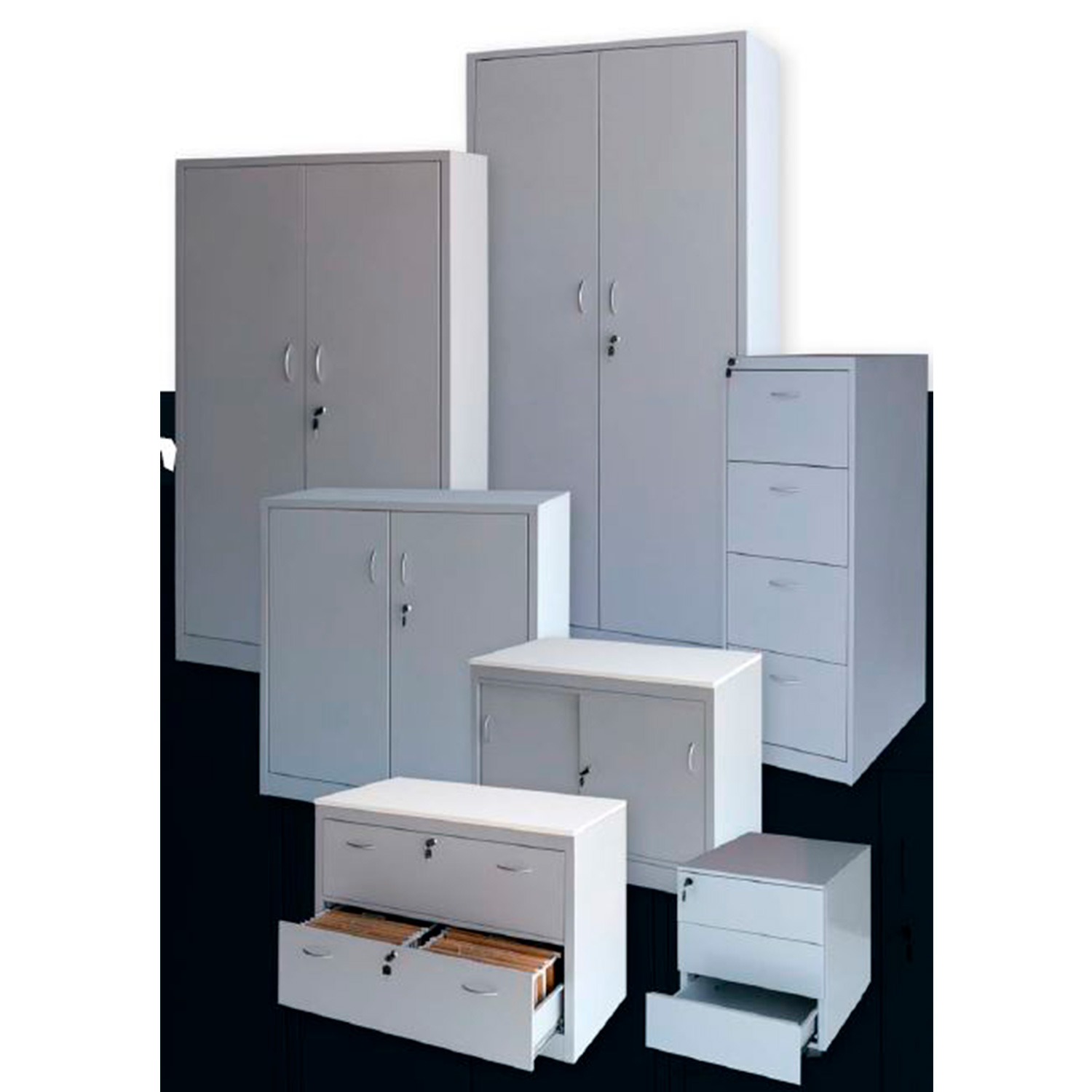 Equipados con estantes regulables en altura y preparados para carpetas colgantes.