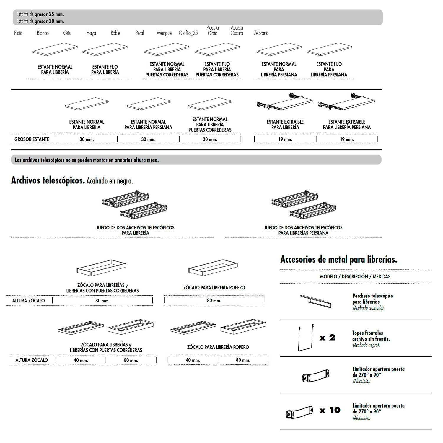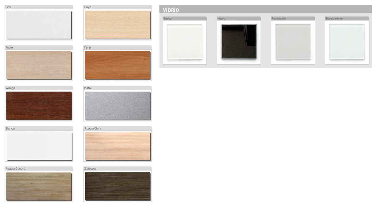 Gran variedad de acabados: plata, blanco, gris, haya, roble, peral, wengué, grafito, acacia clara, acacia oscura, zebrano.