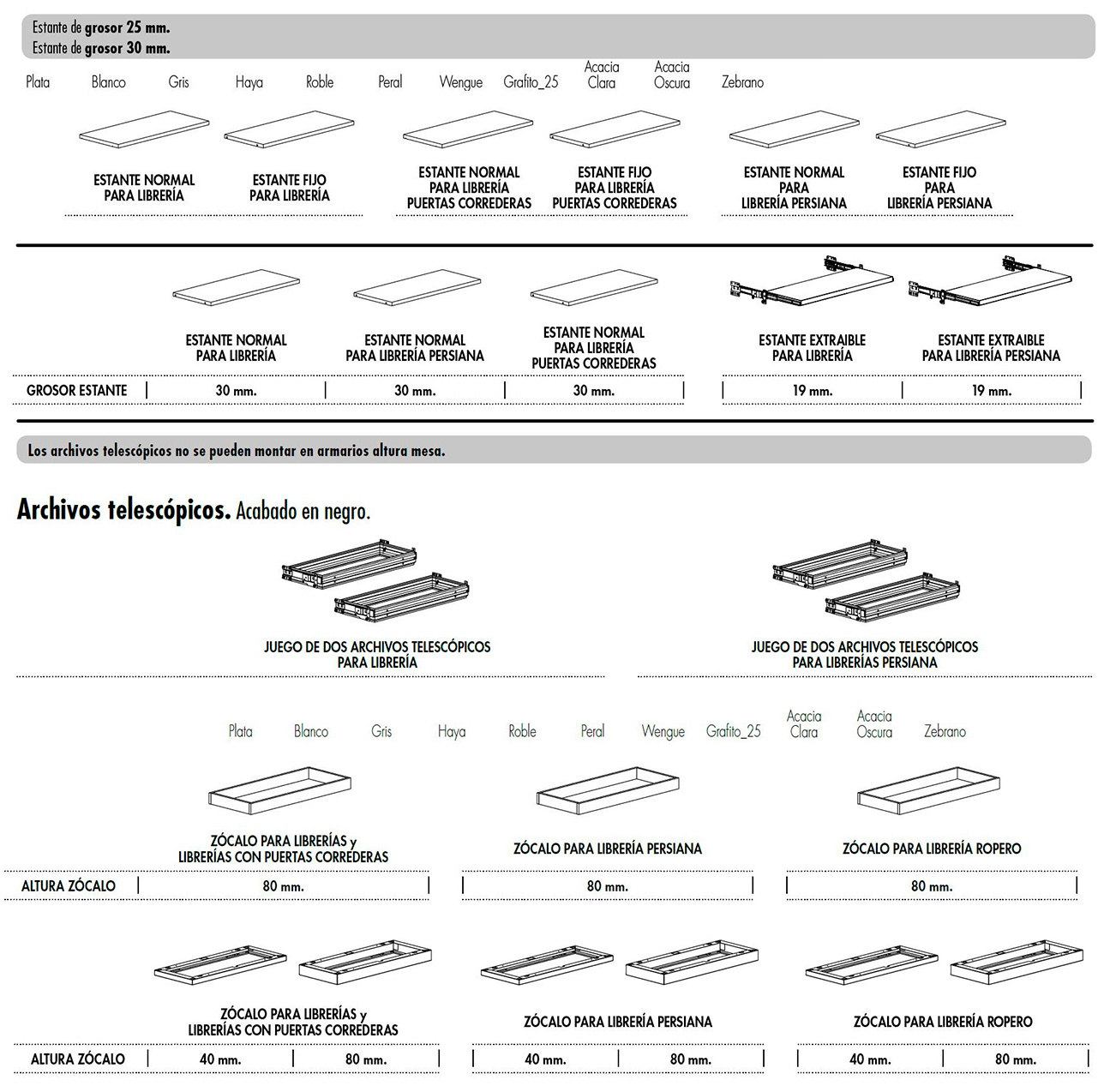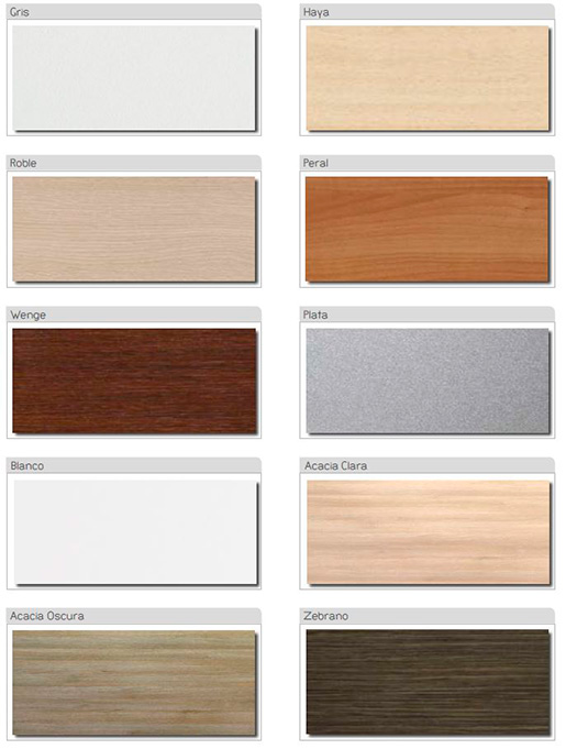 Gran variedad de acabados: plata, blanco, gris, haya, roble, peral, wengué, grafito, acacia clara, acacia oscura, zebrano.