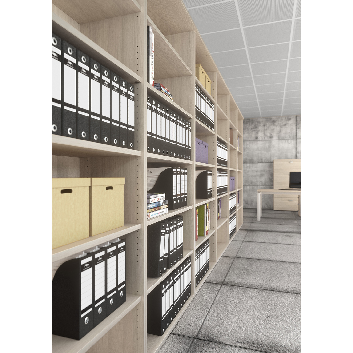 En todos los estantes incluye en la parte inferior un soporte para carpetas A4 fijas.
