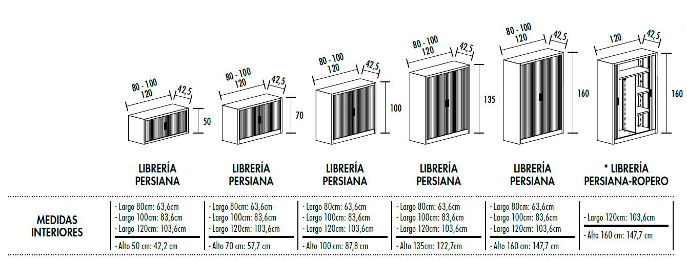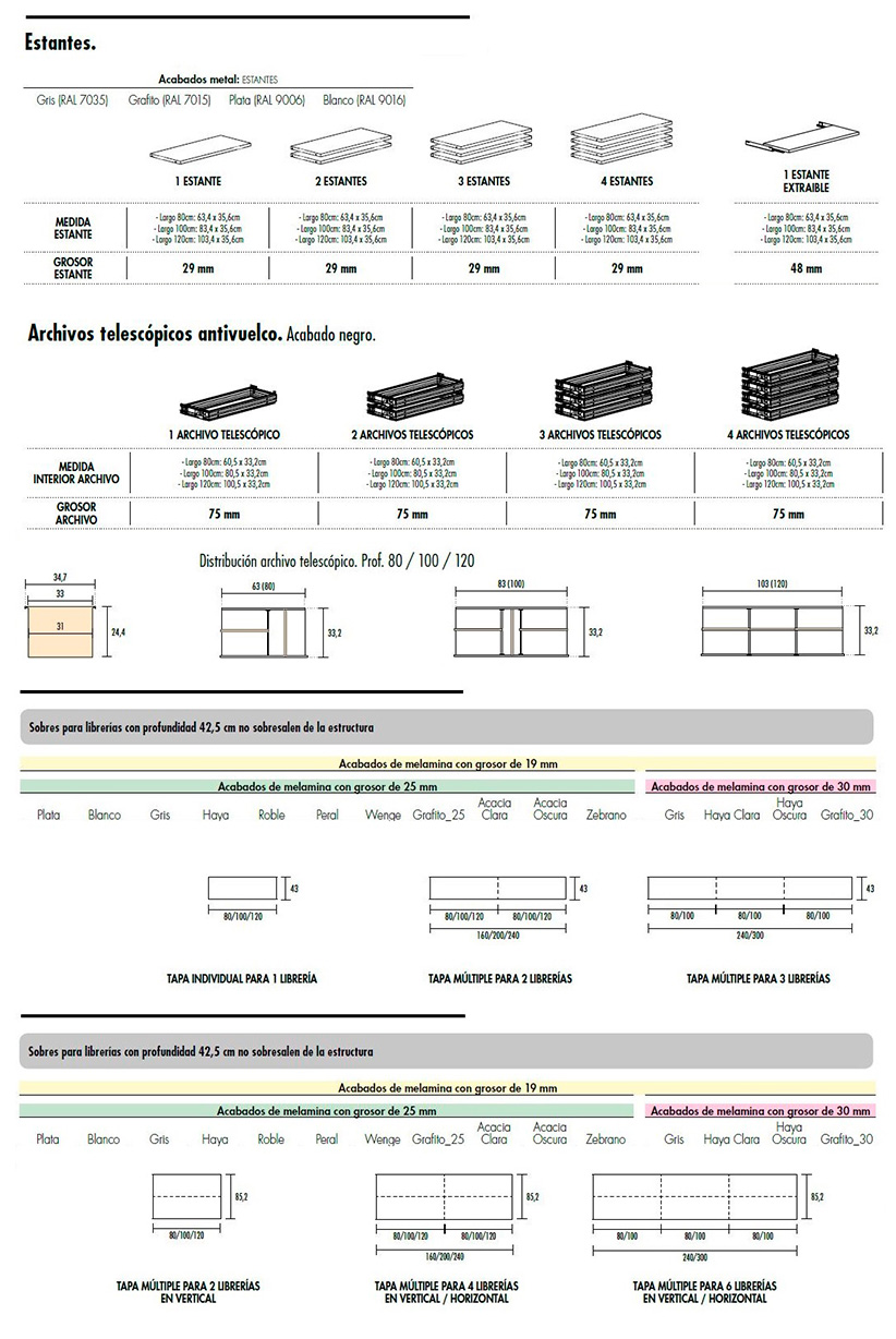a) Múltiples lineales: hasta 3 librerías del mismo ancho (excepto los de 1200 que sólo pueden ser hasta 2). Fabricados de melamina de 19 mm, 25 mm o 30 mm se colocan sobre lo estructuro metálico. Mismos acabados que los tapas individuales.