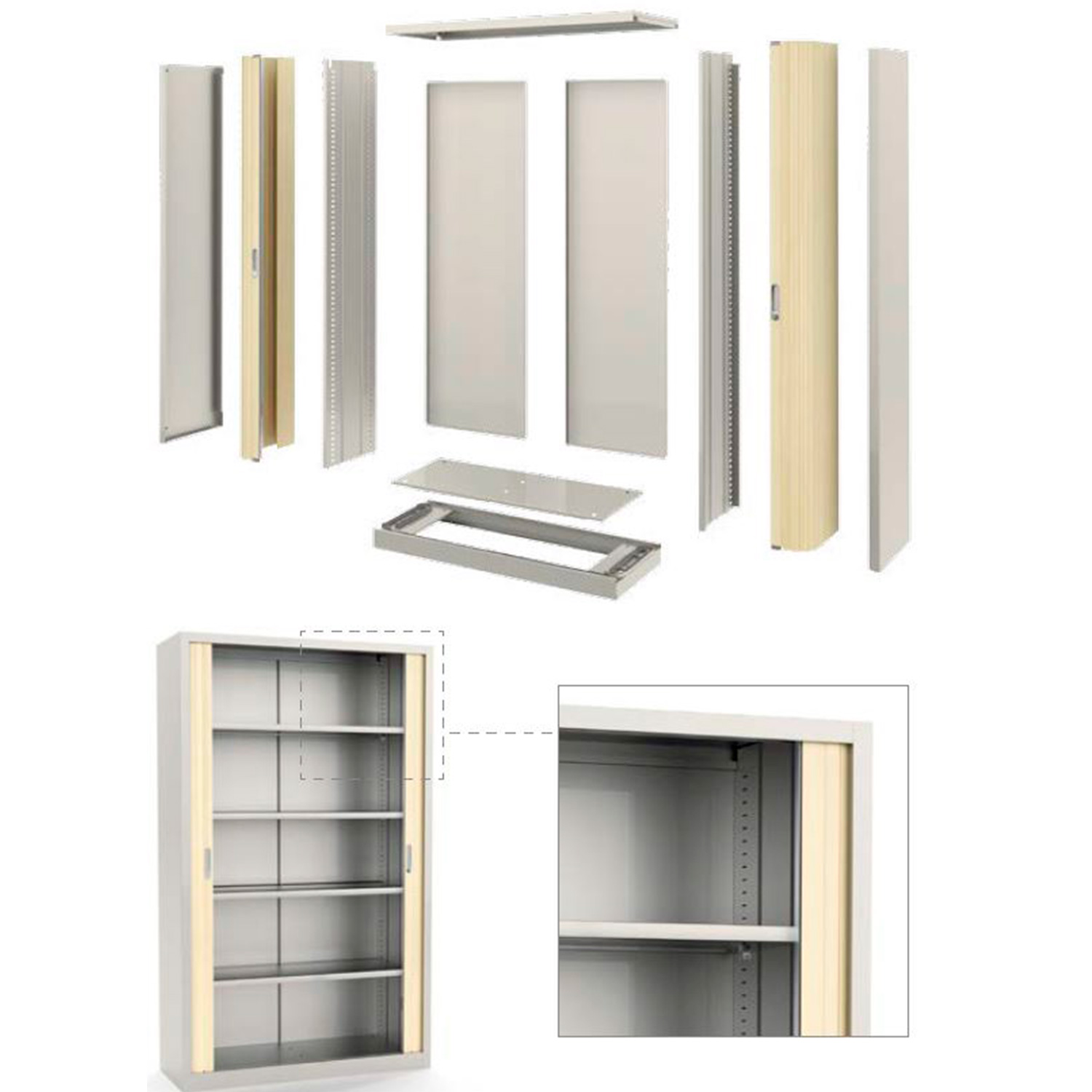 Laterales exteriores, sobre y bajo fabricados en chopo laminado en frío de 0,8 mm DC01 y 1.2 mm en zócalo, soporte niveladores y soporte caracola inferior. Laterales interiores fabricados en 0,8 mm, desmontables y unidos o la estructura mediante tornillería rosco chapa DIN 7982 zincado blanco. Bajos incluyen 2 refuerzos que actúan como soporte paro los niveladores regulables interiormente, paro un correcto asentamiento de lo librería al suelo. Librerías desmontadas (estructura unido mediante tornillería rosca chapa DIN 7982 zincado blanco).