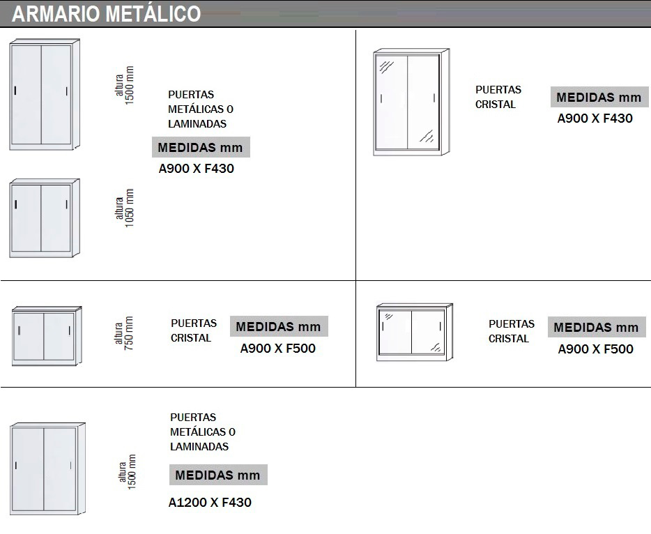 Armarios metálicos fabricados en chapa de acero de 0.8 mm de espesor, pulida y laminada en frio, proceso que dota al material de gran dureza y resistencia. Los armarios son desmontables con elementos unidos a la estructura mediante tornillo rosca-chapa.