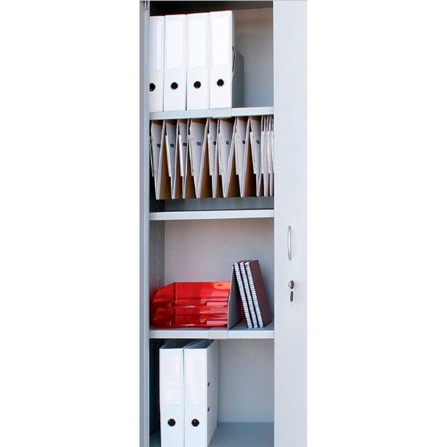 Los estantes están preparados para carpetas colgantes, de 34 cm, con el visor en la parte frontal de la carpeta. Dichas carpetas se cuelgan en la parte inferior del estante, en los pliegues anterior y posterior, para el máximo aprovechamiento del hueco en el armario.