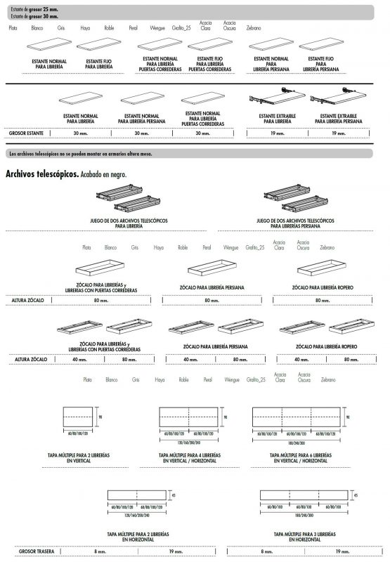 Gran variedad de acabados: plata, blanco, gris, haya, roble, peral, wengué, grafito, acacia clara, acacia oscura, zebrano.