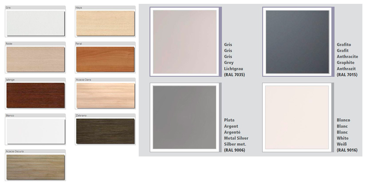 Gran variedad de acabados: plata, blanco, gris, haya, roble, peral, wengué, grafito, acacia clara, acacia oscura, zebrano.