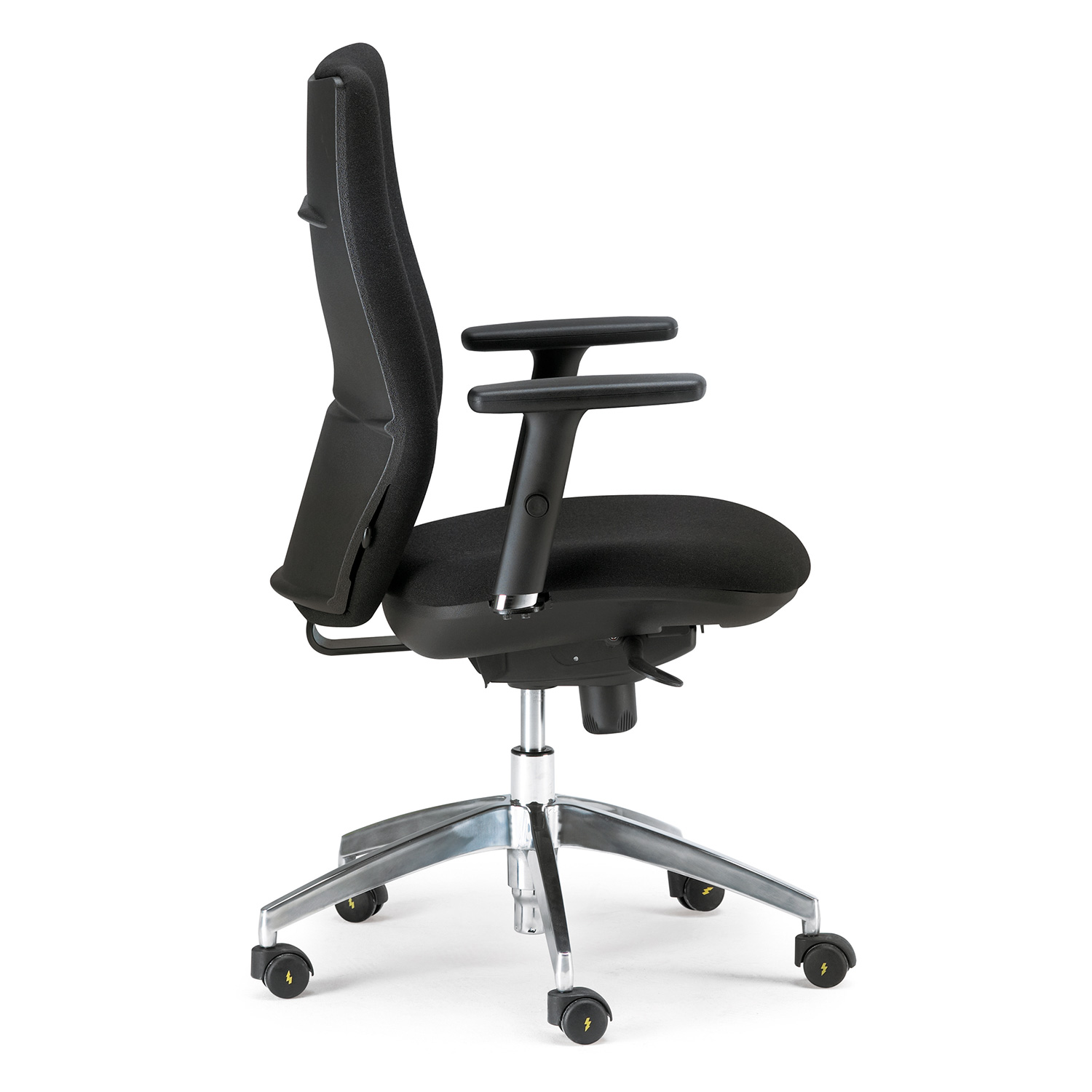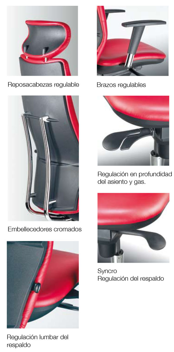 Silla giratoria, asiento regulable en altura, brazos regulables en altura, regulación del asiento en profundidad, regulación lumbar y regulación en inclinación de asiento y respaldo (sincro).