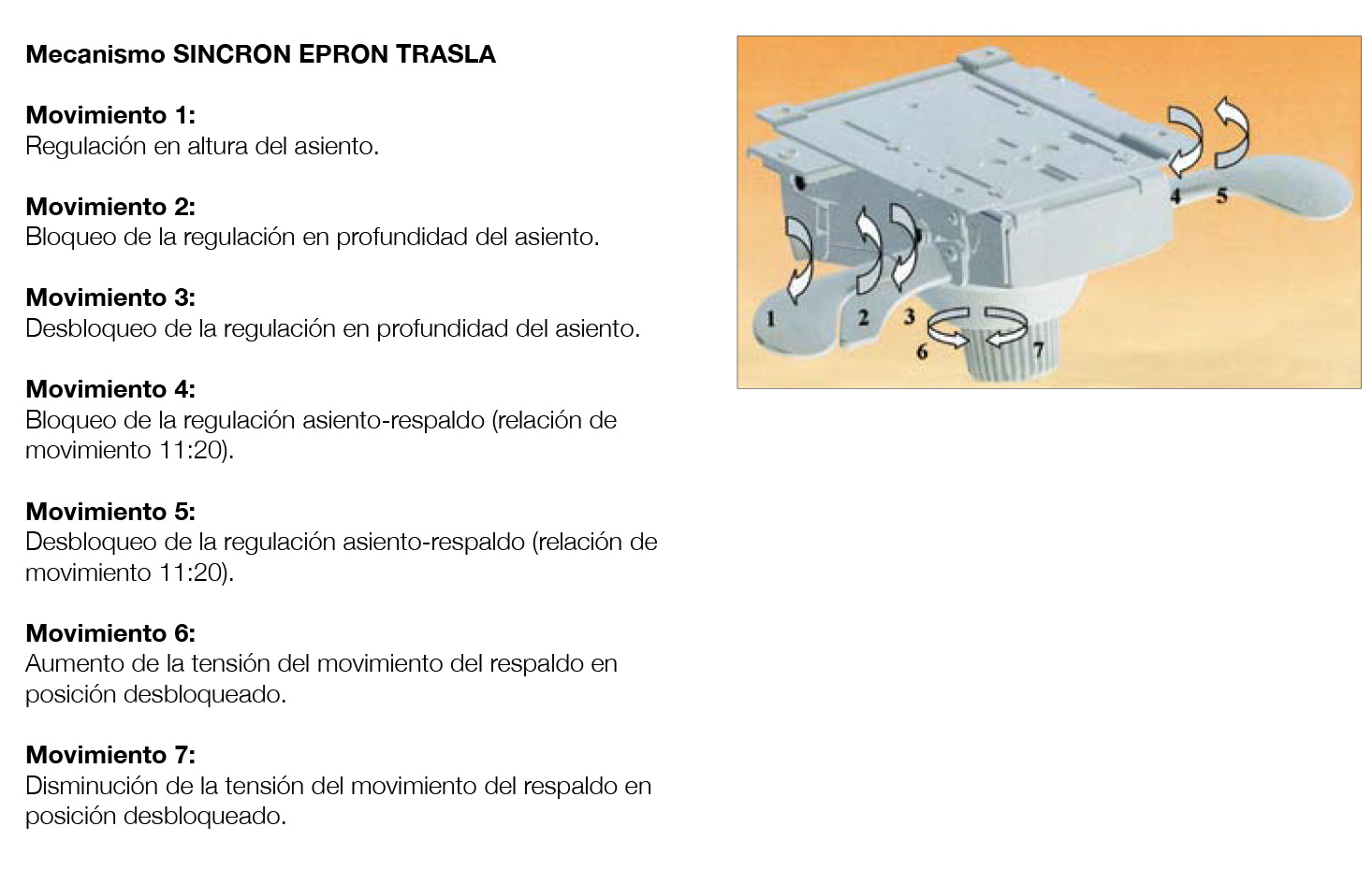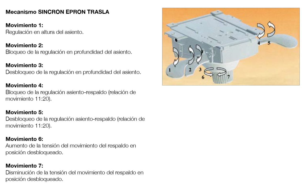 En cuanto al mecanismo sincronizado, es un bloque que incorpora el movimiento de regulación del asiento en profundidad al ya conocido de regulación asiento-respaldo. Debemos mencionar, que tiene 5 posiciones de fijación del respaldo, así como otras 5 posiciones de fijación de la profundidad del asiento, con una carrera de 60 mm. La regulación -respaldo cumple una relación de movimiento de 2:1,1.