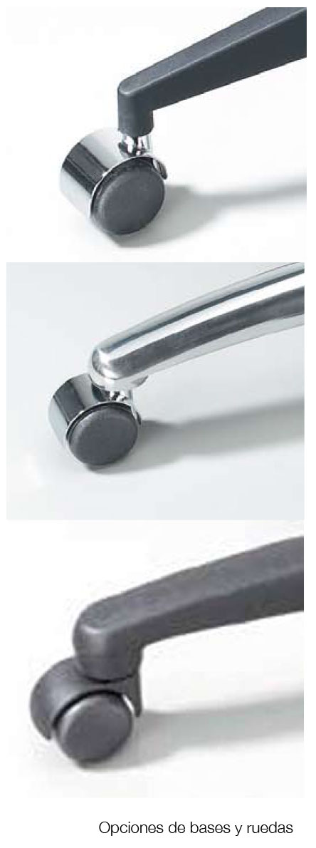 Debemos mencionar también que hay un amplio abanico de opciones para la elección de rueda. Existe la posibilidad de que las ruedas sean rodadura blandas, antiestáticas, duras y con freno, dependiendo de los aspectos funcionales y estéticos del lugar para el que se compre el producto o del usuario final.