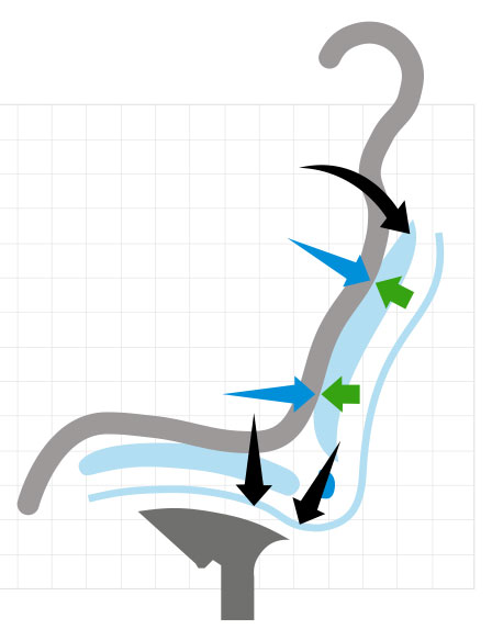 - Mediante una cola metálica de 60 mm de ancho por 8 mm de grosor, lo que da a la estructura cierta flexibilidad en el respaldo, con un ligero efecto de muelleo.