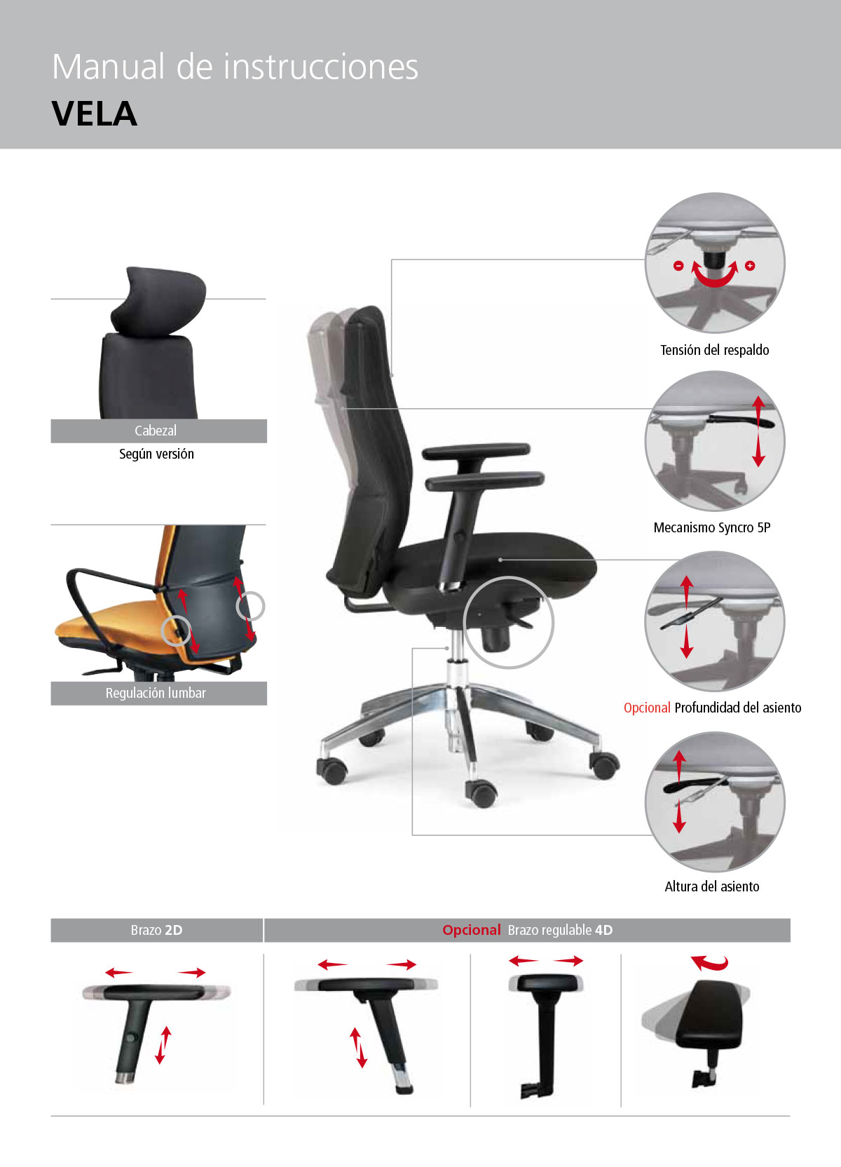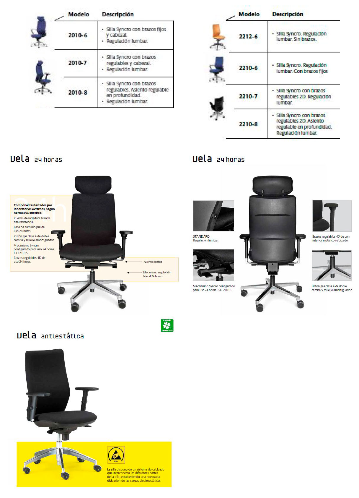 En cuanto a opciones de la serie, cuenta con todo tipo de regulaciones para hacerla totalmente adaptable a cada usuario en cuestión. Cuenta con dos tipos de mecanismo, brazo fijo o regulable en altura, puede ser con cabezal o sin él, regulación lumbar y el confidente asociado es de base de patín. Estas características hacen de la silla Vela una silla muy versátil, de líneas muy modernas y una vida útil larga, ya que, aún siendo joven, posee certificaciones otorgadas por un laboratorio externo acreditado por ENAC.