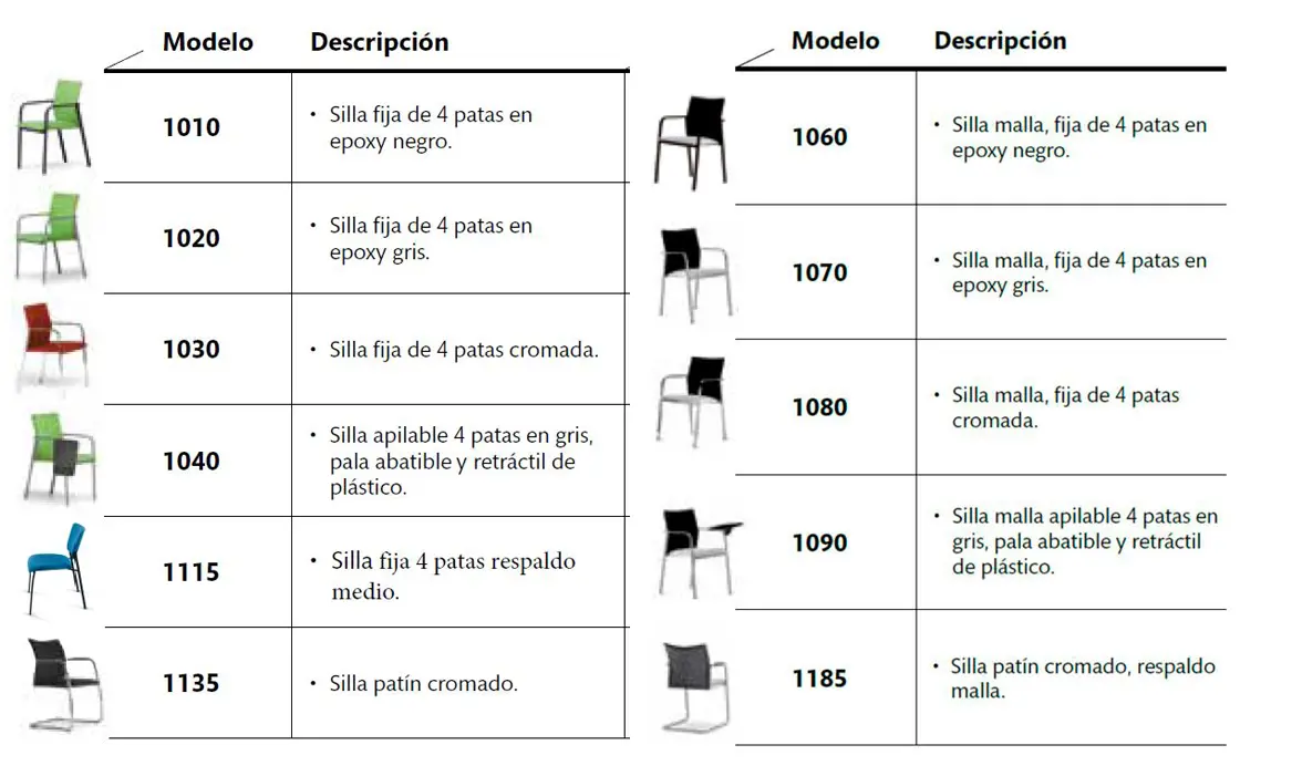 La estructura de la silla de cuatro patas, se fabrica con tubo de al carbono estructural de forma ovalada y medidas 30 x 15 x 2 mm. lo que le confiere un acabado resistente y de aspecto atractivo.