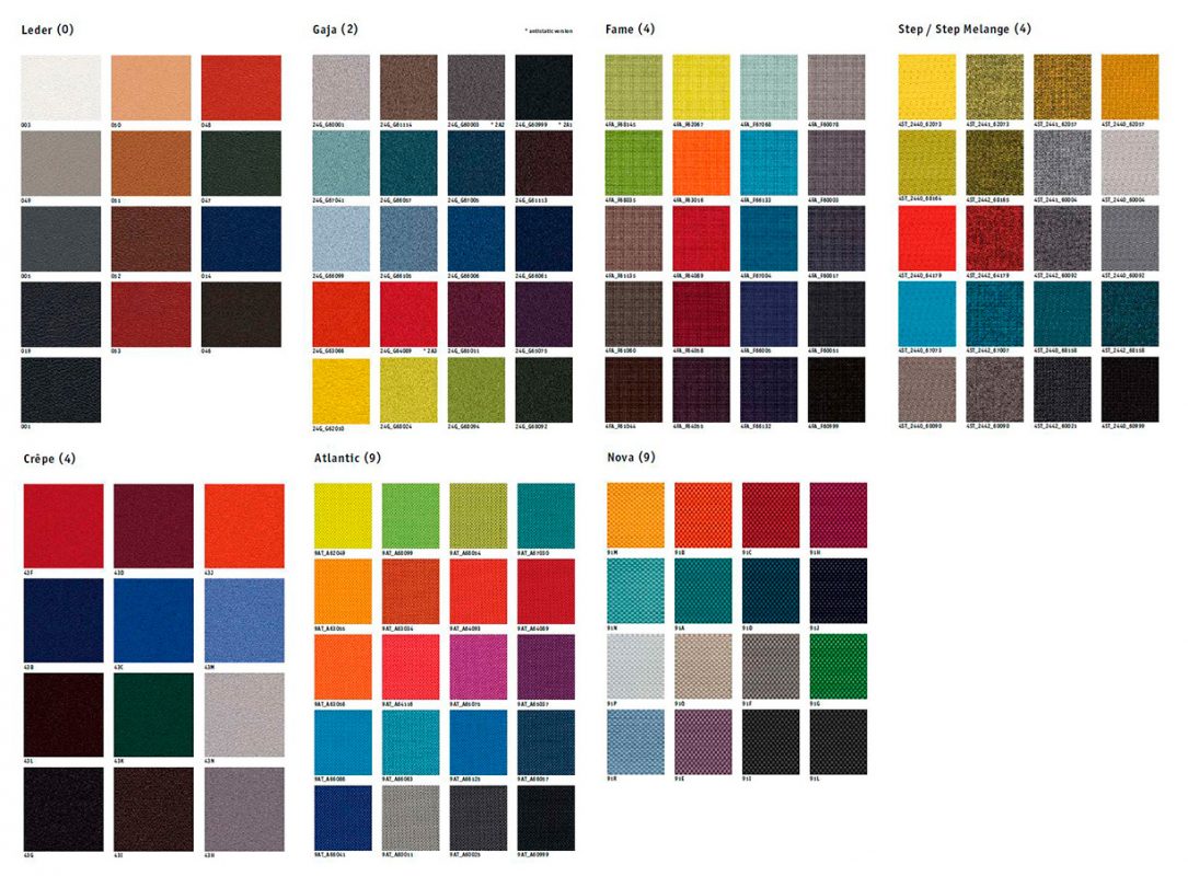 Ambas versiones se ofrecen con asiento redondo tapizado, en polipropileno o en madera barnizada; o con asiento ergonómico básico y respaldo, tapizados o en madera barnizada. Los modelos con asiento y respaldo tapizados no son recomendados para un uso intensivo, ni para peso superior a 90 kg, (el peso del usuario debe ser repartido uniformemente en toda las superficie del asiento)